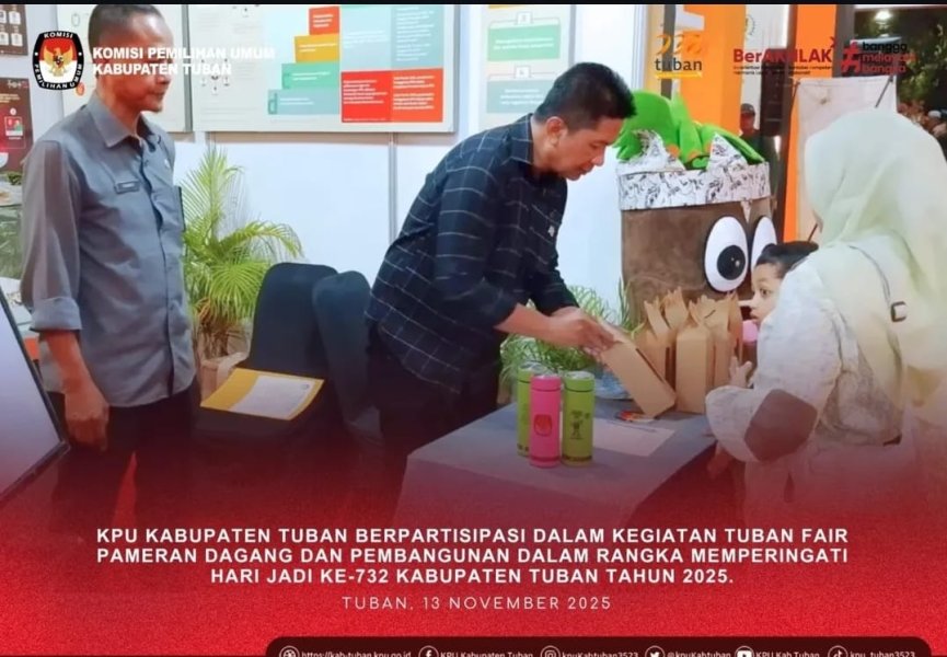 Tuban, kab-tuban.kpu.go.ig - KPU Kabupaten Tuban turut berpartisipasi dalam kegiatan Tuban Fair Pameran Dagang dan Pembangunan yang digelar dalam rangka memperingati Hari Jadi Ke-732 Kabupaten Tuban Tahun 2025. Kegiatan ini dilaksanakan pada Kamis, 13 November 2025, dan berlokasi di Gedung Olahraga (GOR) Rangga Jaya Anoraga Tuban, Jalan Teuku Umar, Tuban. Pada kegiatan pameran tersebut, KPU Kabupaten Tuban menampilkan berbagai informasi kepemiluan yang dikemas secara menarik dan edukatif. Informasi yang disajikan meliputi sejarah Pemilu, hasil perolehan suara Pemilu dan Pemilihan, peta daerah pemilihan (dapil), tingkat partisipasi masyarakat, hingga diorama Tempat Pemungutan Suara (TPS). Selain itu, terdapat pula berbagai materi lain yang dapat menambah wawasan pengunjung mengenai kepemiluan. Selama pameran berlangsung, KPU Kabupaten Tuban juga menyediakan souvenir bagi pengunjung yang dapat menjawab pertanyaan seputar kepemiluan yang disampaikan oleh petugas stand. Kegiatan interaktif ini diharapkan dapat meningkatkan pemahaman masyarakat terhadap proses dan tahapan penyelenggaraan Pemilu. KPU Kabupaten Tuban mengajak seluruh masyarakat untuk datang dan mengunjungi stand KPU selama gelaran Tuban Fair berlangsung. Pengunjung juga berkesempatan mendapatkan hadiah menarik selama persediaan masih tersedia. Dengan keikutsertaan ini, KPU Kabupaten Tuban berharap dapat memperluas edukasi kepemiluan dan meningkatkan kesadaran masyarakat akan pentingnya partisipasi dalam Pemilu demi terwujudnya proses demokrasi yang berkualitas. (humas) ....