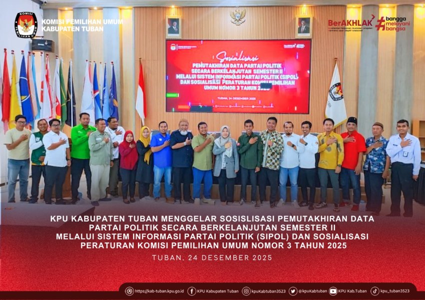 Tuban, kab-tuban.kpu.go.ig - Rabu (24/12/2025), Komisi Pemilihan Umum (KPU) Kabupaten Tuban menyelenggarakan kegiatan Sosialisasi Pemutakhiran Data Partai Politik Semester II secara berkelanjutan melalui Sistem Informasi Partai Politik (Sipol). Kegiatan ini dibuka secara resmi oleh Ketua KPU Kabupaten Tuban, Zakiyatul Munawaroh. Dalam sambutannya, ia menekankan pentingnya pemutakhiran data partai politik secara berkala sebagai bagian dari upaya menjaga akurasi dan validitas data kepemiluan. Sosialisasi diikuti oleh perwakilan seluruh partai politik tingkat Kabupaten Tuban, serta dihadiri oleh Bawaslu Kabupaten Tuban, Badan Kesatuan Bangsa dan Politik (Kesbangpol), dan Sekretariat Dewan (Sekwan). Penyampaian materi disampaikan oleh Saiful Anwar, Divisi Teknis Penyelenggaraan KPU Kabupaten Tuban. Dalam pemaparannya, ia menjelaskan bahwa fokus pemutakhiran data partai politik meliputi pembaruan kepengurusan, keterwakilan perempuan, keanggotaan, serta domisili kantor partai politik yang dilakukan secara berkelanjutan melalui Sipol. Selain itu, KPU Kabupaten Tuban juga menyosialisasikan Peraturan KPU Nomor 3 Tahun 2025 yang mengatur tentang mekanisme Penggantian Antarwaktu (PAW) Anggota Legislatif. Sosialisasi ini bertujuan agar partai politik memahami prosedur dan ketentuan yang berlaku sesuai dengan peraturan perundang-undangan. (humas) ....