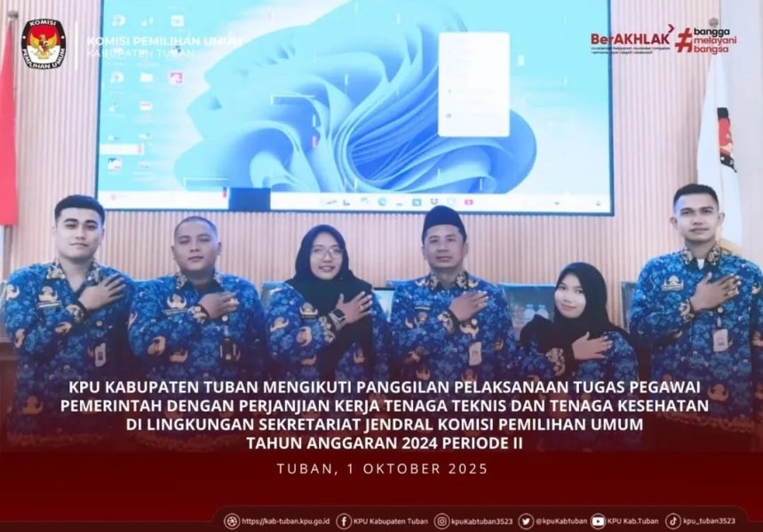 Tuban, kab-tuban.kpu.go.ig - Rabu (1/10/2025), KPU Kabupaten Tuban mengikuti kegiatan Panggilan Melaksanakan Tugas Pegawai Pemerintah dengan Perjanjian Kerja (PPPK) Tenaga Teknis dan Tenaga Kesehatan di lingkungan Sekretariat Jenderal KPU Tahun Anggaran 2024 Periode II yang diselenggarakan secara daring oleh KPU Provinsi Jawa Timur.
