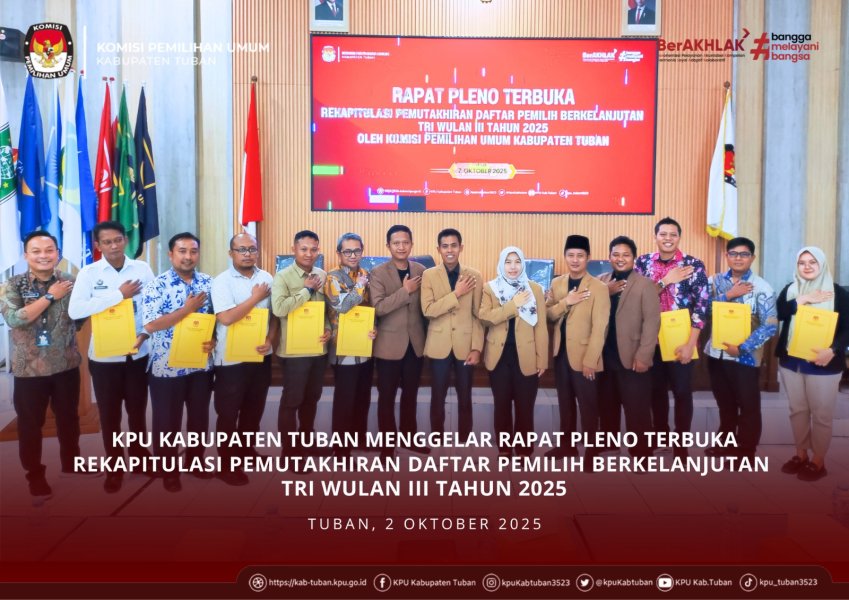 Tuban, kab-tuban.kpu.go.ig - Kamis (2/10/2025) KPU Kabupaten Tuban menggelar Rapat Pleno Terbuka Rekapitulasi Pemutakhiran Daftar Pemilih Berkelanjutan (PDPB) Triwulan III Tahun 2025 tingkat Kabupaten Tuban.