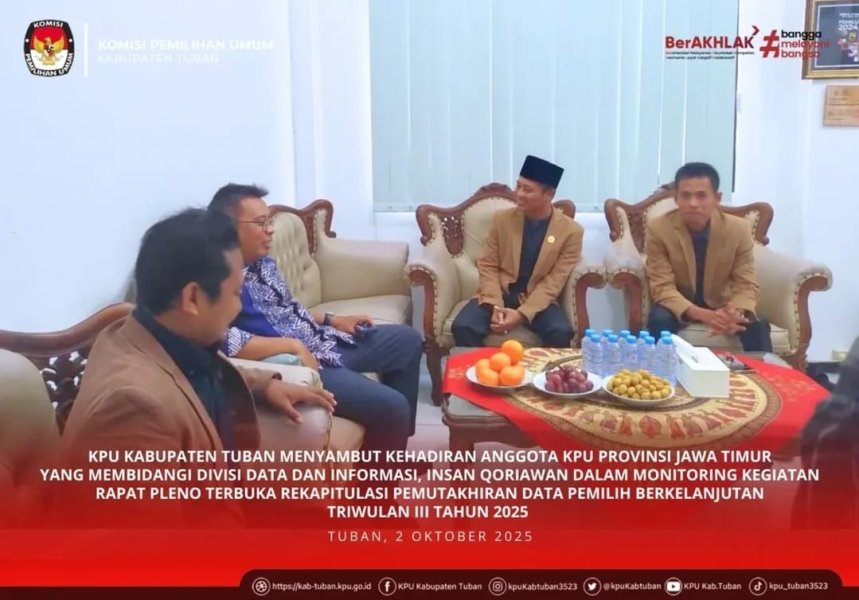 Tuban, kab-tuban.kpu.go.ig - Anggota KPU Provinsi Jawa Timur yang membidangi Divisi Data dan Informasi, Insan Qoriawan, melakukan kunjungan ke KPU Kabupaten Tuban dalam rangka monitoring pelaksanaan Rapat Pleno Terbuka Rekapitulasi Pemutakhiran Data Pemilih Berkelanjutan Triwulan III Tahun 2025, pada Kamis (2/10/2025).