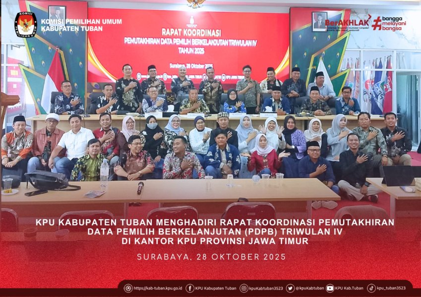 Tuban, kab-tuban.kpu.go.ig - Divisi dan Kepala Sub Bagian Perencanaan Data dan Informasi KPU Kabupaten Tuban, Ulil Abror Al Mahmud dan Fitri Maharani Yudhita menghadiri Rapat Koordinasi Pemutakhiran Data Pemilih Berkelanjutan (PDPB) Triwulan IV, Selasa (28/10/2025) di kantor KPU Provinsi Jawa Timur beserta seluruh satuan kerja KPU Kabupaten/Kota se-Jawa Timur. Kegiatan ini mendasarkan pada Peraturan KPU Nomor 1 Tahun 2025 Tentang Pemutakhiran Data Pemilih Berkelanjutan.