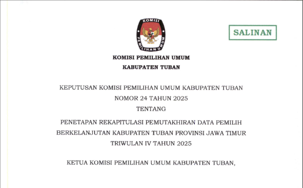 Tuban, kab-tuban.kpu.go.ig - Pengumuman Rekapitulasi Daftar Pemilih Berkelanjutan Kabupaten Tuban Provinsi Jawa Timur Triwulan IV Tahun 2025.