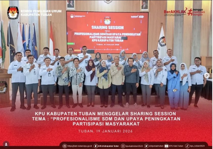 Tuban, kab-tuban.kpu.go.ig - Senin (19/1/2026), Komisi Pemilihan Umum (KPU) Kabupaten Tuban menggelar Sharing Session dengan tema “Profesionalisme Sumber Daya Manusia dalam Upaya Peningkatan Partisipasi Masyarakat”. Kegiatan ini dilaksanakan sebagai bagian dari upaya penguatan kualitas sumber daya manusia dalam mendukung penyelenggaraan demokrasi yang berintegritas.