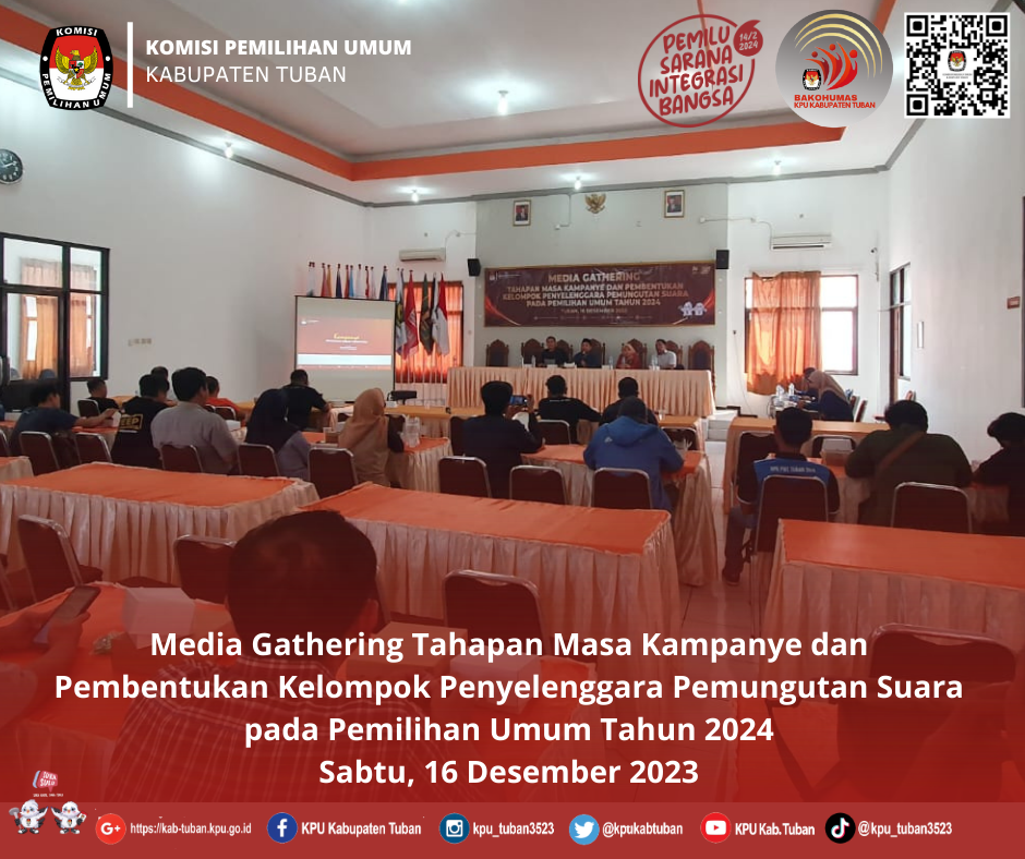 Tuban, kab-tuban.kpu.go.id - KPU Kabupaten Tuban menggelar Media Gathering Tahapan Masa Kampanye dan Pembentukan Kelompok Penyelenggara Pemungutan Suara pada Pemilihan Umum Tahun 2024 bersama jurnalis/wartawan yang tergabung dalam Persatuan Wartawan Indonesia (PWI) Kabupaten Tuban dan Ronggolawe Press Solidarity (RPS), Sabtu siang (16/12/3023).