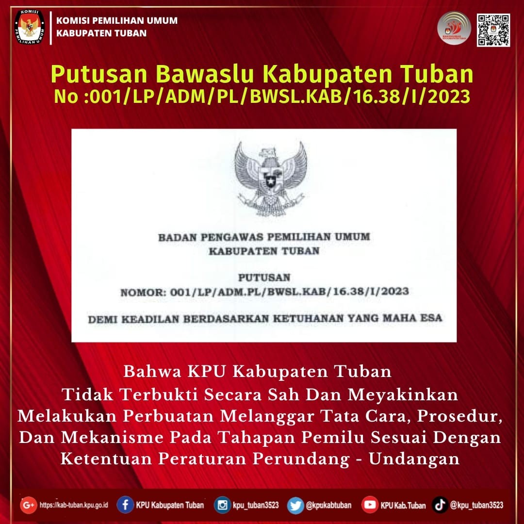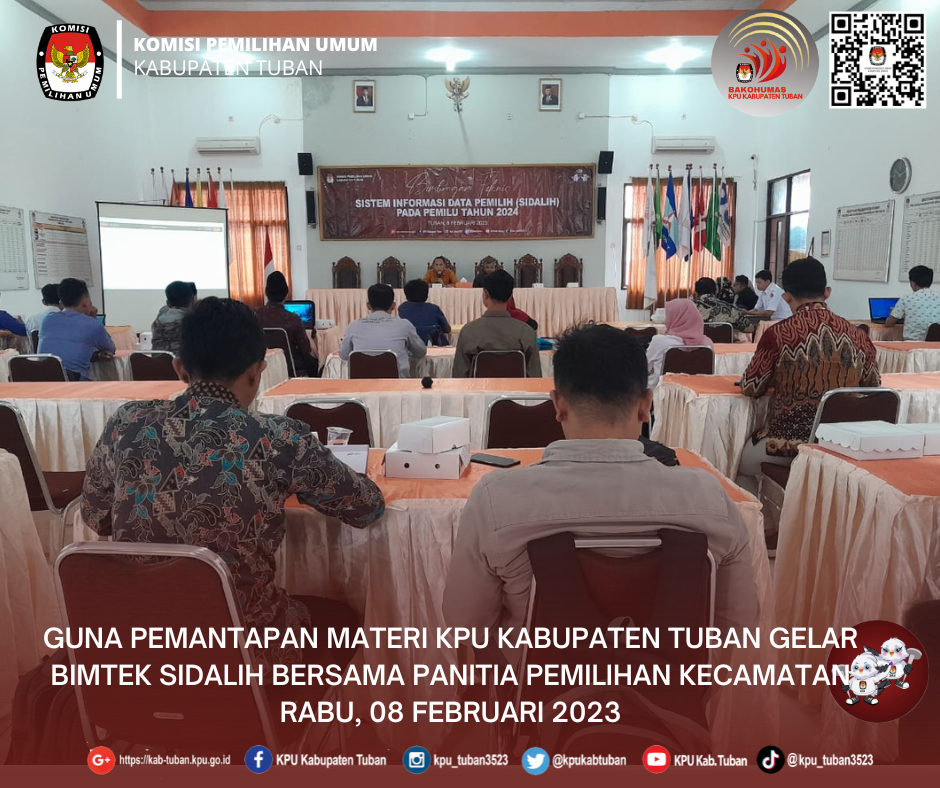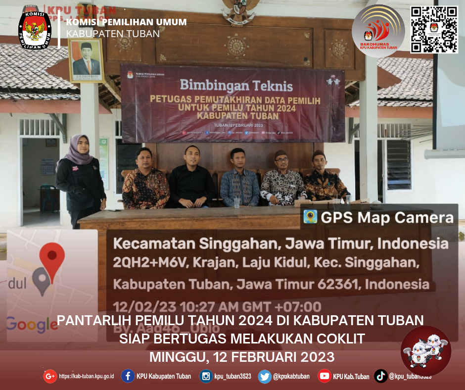 Tuban, kab-tuban.kpu.go.id - Minggu (12/02/2023), sejak pukul 08.00 WIB, Panitia Pemilihan Kecamatan (PPK) bersama Panitia Pemungutan Suara (PPS) se- Kabupaten Tuban menyelenggarakan 4 (empat) agenda kegiatan yang sekaligus diselenggarakan secara serentak. Pelantikan Petugas Pemutakhiran Data Pemilih (Pantarlih), Apel Kesiapan Pantarlih, Bimbingan Teknis Pantarlih, dan Pencocokan dan Penelitian (coklit) yang merupakan tindak lanjut pelaksanaan Surat Ketua KPU RI Nomor 147/PL.01-SD/14/2023, tanggal 5 Februari 2023, perihal : Jadwal Pemetaan TPS, Apel, Kesiapan, dan Bimtek Pantarlih.