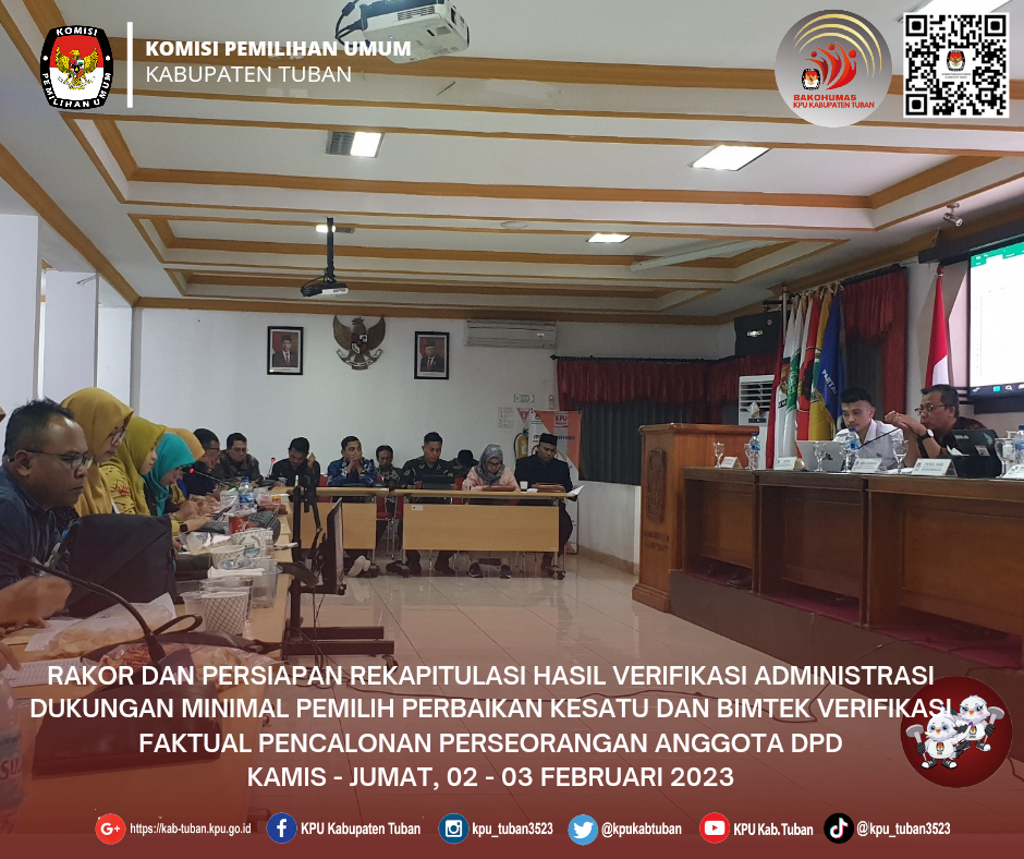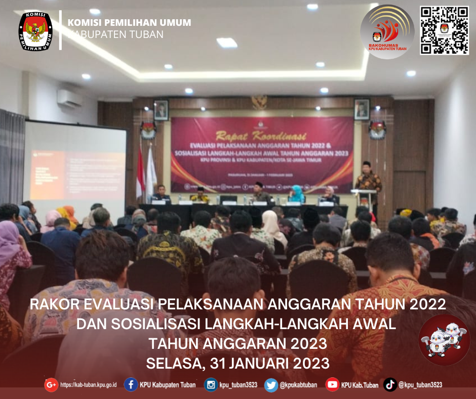 Pasuruan, kab-tuban.kpu.go.id - Ketua, Sekretaris, Divisi dan Kepala Sub Bagian Perencanaan Data dan Informasi KPU Kabupaten Tuban menghadiri Rapat Koordinasi (Rakor) Evaluasi Pelaksanaan Anggaran Tahun 2022 dan Sosialisasi Langkah-Langkah Awal Tahun Anggaran 2023 KPU Provinsi dan KPU Kabupaten/Kota se-Jawa Timur, Selasa (31/01/2023) sampai Rabu (01/02/2023) di KPU Kabupaten Pasuruan. Rakor dihadiri oleh 38 satuan kerja KPU di wilayah Jawa Timur. Mewakili Ketua KPU Provinsi Jawa Timur yang berhalangan hadir, Gogot Cahyo Baskoro menegaskan bahwa rakor ini sangat penting sebagai sarana evaluasi atas pelaksanaan anggaran tahun 2022 dan referensi dalam menyusun langkah-langkah strategis pengelolaan anggaran tahun 2023. "Yang serapan anggarannya tinggi di tahun lalu bisa berbagi strategi untuk lainnya sehingga pengelolaan anggaran di tahapan pemilu 2024 bisa maksimal," papar Gogot. Sekretaris KPU Provinsi Jawa Timur, Nanik Karsini mengingatkan pentingnya membangun komunikasi dan sinergitas antara Kuasa Pengguna Anggaran (KPA), Pejabat Pembuat Komitmen (PPK), dan Kepala Sub Bagian Perencanaan Data dan Informasi. Ketiganya mengawal penyusunan dan pengelolaan program dan anggaran sehingga target penyerapan anggaran dari KPU RI tercapai, yaitu 95%. KPU Kabupaten Kediri menempati urutan pertama serapan anggaran tertinggi dari KPU se-Jawa Timur sebanyak 99,64%. KPU Kabupaten Tuban mampu memenuhi target serapan anggaran nasional sebesar 95,34%. (dy/humas)