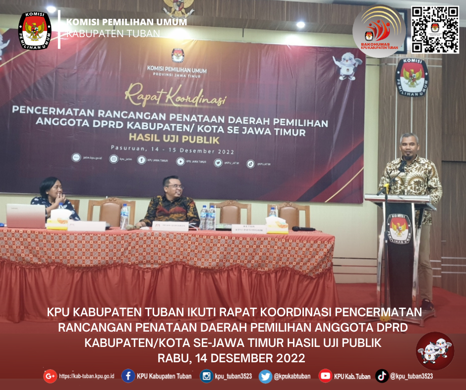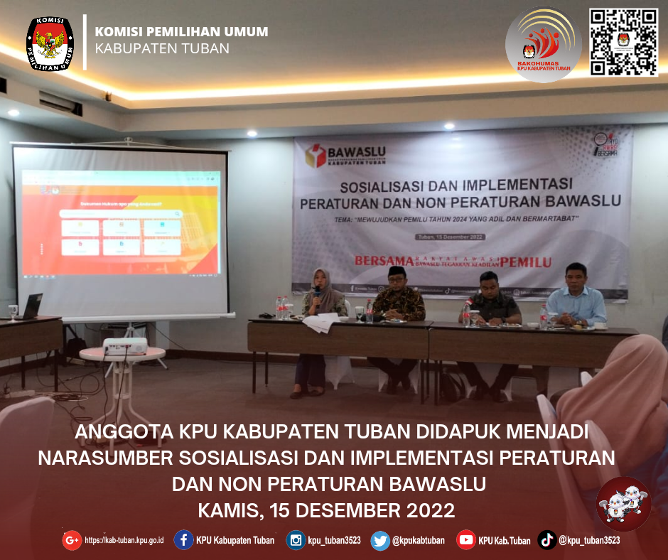 Tuban, kab-tuban.kpu.go.id - Anggota KPU Kabupaten Tuban, Zakiyatul Munawaroh didapuk menjadi Narasumber dalam kegiatan yang diselenggarakan oleh Badan Pengawas Pemilu (Bawaslu) Kabupaten Tuban, bertema Sosialisasi dan Implementasi Peraturan dan Non Peraturan Bawaslu, Kamis (15/12/2022), di sebuah hotel di wilayah Kecamatan Tuban. Komisioner yang membidangi Divisi Sosialisasi Pendidikan Pemilih, Partisipasi Masyarakat, dan Sumber Daya Manusia ini membawakan materi berjudul Peraturan Perundang-undangan Tahapan Pemilu 2024. Zakiya, sapaan kesehariannya, menjelaskan tentang jenis dan hierarki peraturan perundang-undangan di lingkungan Komisi Pemilihan Umum, tahapan pemilu, dan website Jaringan Dokumentasi dan Informasi Hukum (JDIH) milik KPU RI. "JDIH memuat seluruh peraturan mulai dari undang-undang, Peraturan KPU, Keputusan KPU, Surat Dinas, sampai Surat Edaran, yang diterbitkan oleh KPU RI," ujar Zakiya. Peraturan-peraturan yang menjadi dasar hukum dalam setiap tahapan Pemilu 2024 antara lain : Peraturan KPU Nomor 3 Tahun 2022 tentang Tahapan dan Jadwal Penyelenggaraan Pemilu Tahun 2024, Peraturan KPU Nomor 4 Tahun 2022 tentang Pendaftaran, Verifikasi, dan Penetapan Partai Politik Peserta Pemilihan Umum Anggota Dewan Perwakilan Rakyat dan Dewan Perwakilan Rakyat Daerah, Peraturan KPU Nomor 6 Tahun 2022 tentang Penataan Daerah Pemilihan dan Alokasi Kursi Anggota Dewan Perwakilan Rakyat Daerah Kabupaten/Kota Dalam Pemilihan Umum, Peraturan KPU Nomor 7 Tahun 2022 tentang Penyusunan Daftar Pemilih Dalam Penyelenggaraan Pemilihan Umum dan Sistem Informasi Data Pemilih, Peraturan KPU Nomor 8 Tahun 2022 tentang Pembentukan dan Tata Kerja Badan Adhoc Penyelenggara Pemilihan Umum dan Pemilihan Gubernur dan Wakil Gubernur, Bupati dan Wakil Bupati, dan Walikota dan Wakil Walikota, Peraturan KPU Nomor 9 Tahun 2022 tentang Partisipasi Masyarakat Dalam Pemilihan Umum dan Pemilihan Gubernur dan Wakil Gubernur, Bupati dan Wakil Bupati, dan/atau Walikota dan Wakil Walikota, dan Peraturan KPU Nomor 10 Tahun 2022 tentang Pencalonan Perseorangan Peserta Pemilihan Umum Anggota Dewan Perwakilan Daerah. (dy/hupmas)