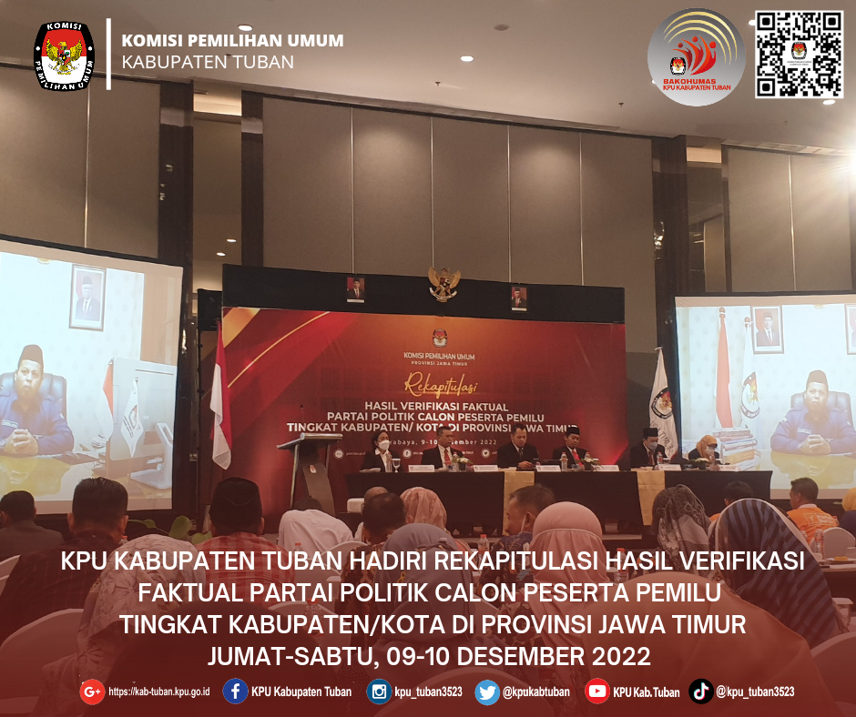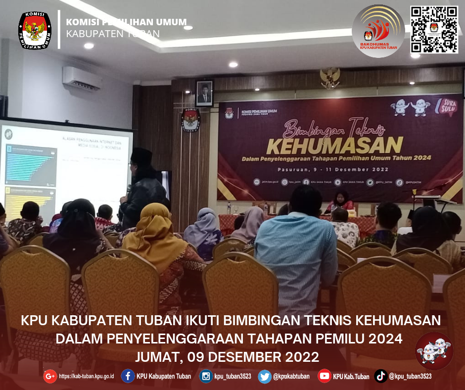 Tuban, kab-tuban.kpu.go.id - Jumat (09/12/2022), perwakilan KPU Kabupaten Tuban mengikuti Bimbingan Teknis Kehumasan Dalam Penyelenggaraan Tahapan Pemilu 2024 yang diwakili Divisi Sosdiklih, Parmas, dan SDM, Zakiyatul Munawaroh, Sekretaris, Mochamad Arifuddin dan 2 (dua) staf Parmas. Kegiatan ini dilaksanakan di KPU Kabupaten Pasuruan dan diikuti oleh 38 KPU Kabupaten/Kota se-Jawa Timur. Kegiatan ini dibuka Divisi Sosdiklih dan Parmas KPU Provinsi Jawa Timur, Gogot Cahyo Baskoro. Dalam pembukaannya beliau menyampaikan bahwa sebagai humas kepentingan publik mesti dipelajari. Tujuannya agar informasi yang ingin disampaikan dapat dipahami oleh publik dengan baik. “Humas harus bisa mencitrakan lembaga dengan baik sehingga publik tertarik untuk lebih tahu tentang KPU. Sehingga diperlukan komitmen membangun kepercayaan publik terhadap KPU," jelasnya. Dalam bimtek ini para Peserta alan dibekali dengan materi baik teoritik maupun praktis. Diantaranya Public Relation dan Manajemen Krisis dalam Penyelenggaraan Pemilu Tahun 2024 yang akan disampaikan oleh Akademisi Ilmu Komunikasi Universitas Brawijaya. Kedua, Kolaborasi Multipihak dalam Penanganan Disinformasi Kepemiluan. (af/humas)