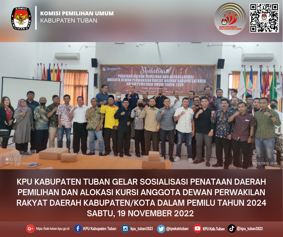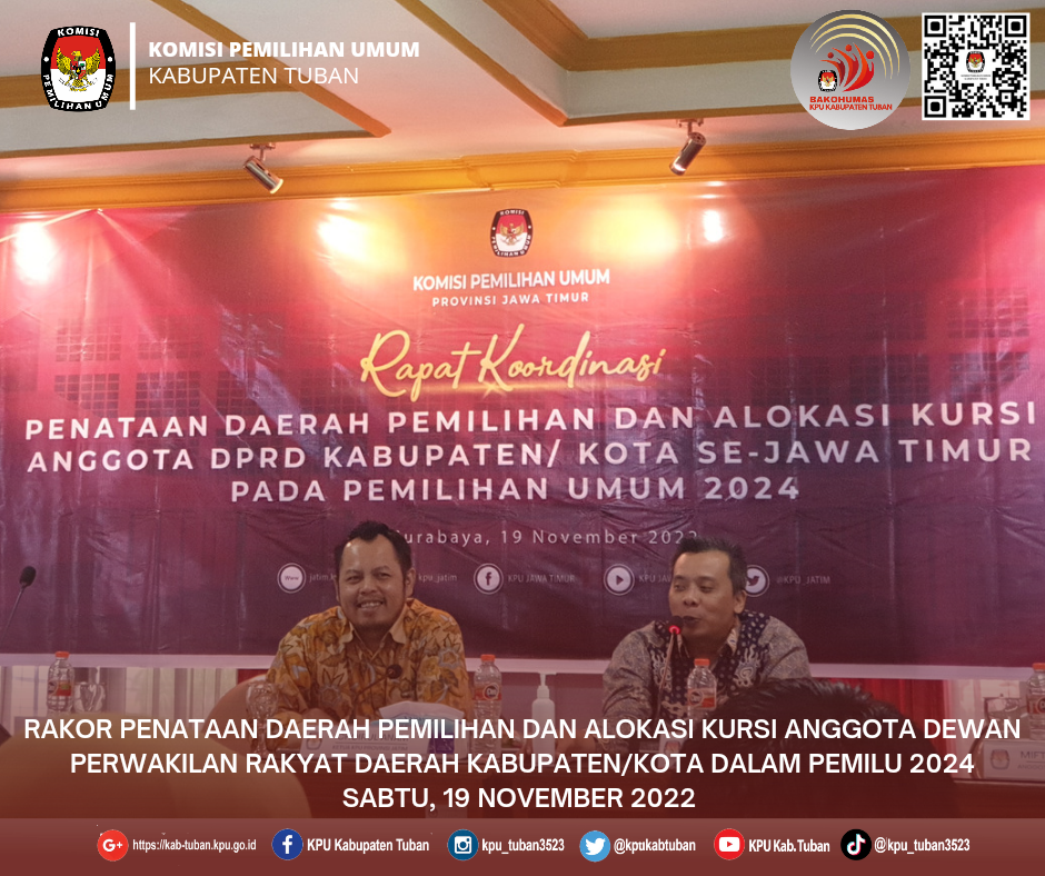 Surabaya, kab-tuban.kpu.go.id - Sabtu pagi (19/11/2022) bertempat di Aula Lantai 2 KPU Provinsi Jawa Timur, Jalan Raya Tenggilis No. 1 Surabaya berlangsung Rapat Koordinasi Penataan Daerah Pemilihan dan Alokasi Kursi Anggota Dewan Perwakilan Rakyat Daerah Kabupaten/Kota se-Jawa Timur pada Pemilu 2024. Rakor dihadiri 38 KPU Kabupaten/Kota yang terdiri dari Anggota KPU Divisi Teknis Penyelenggaraan, Kasubbag Teknis Penyelenggaraan Pemilu, Partisipasi, dan Hubungan Masyarakat serta Operator Sidapil. Acara dibuka oleh Ketua KPU Provinsi Jawa Timur, Choirul Anam. Dalam sambutannya, Anam menegaskan pentingnya memahami 7 (tujuh) prinsip penataan daerah pemilihan (dapil). 7 (tujuh) prinsip tersebut adalah kesetaraan nilai suara, ketaatan pada sistem Pemilu yang proporsional, proporsionalitas, integralitas wilayah, berada dalam cakupan wilayah yang sama, kohesivitas, dan kesinambungan. "Kawan-kawan harus dipahami secara utuh dan tidak sepenggal tentang dapil. Kenapa dapil harus tetap dan kenapa harus bergeser," jelasnya. Acara kemudian dilanjutkan dengan penyampaian pemaparan rancangan penataan daerah pemilihan dan alokasi kursi oleh 38 KPU Kabupaten/Kota se-Jawa Timur. (humas)