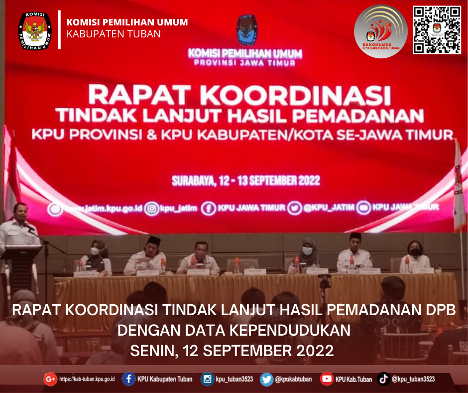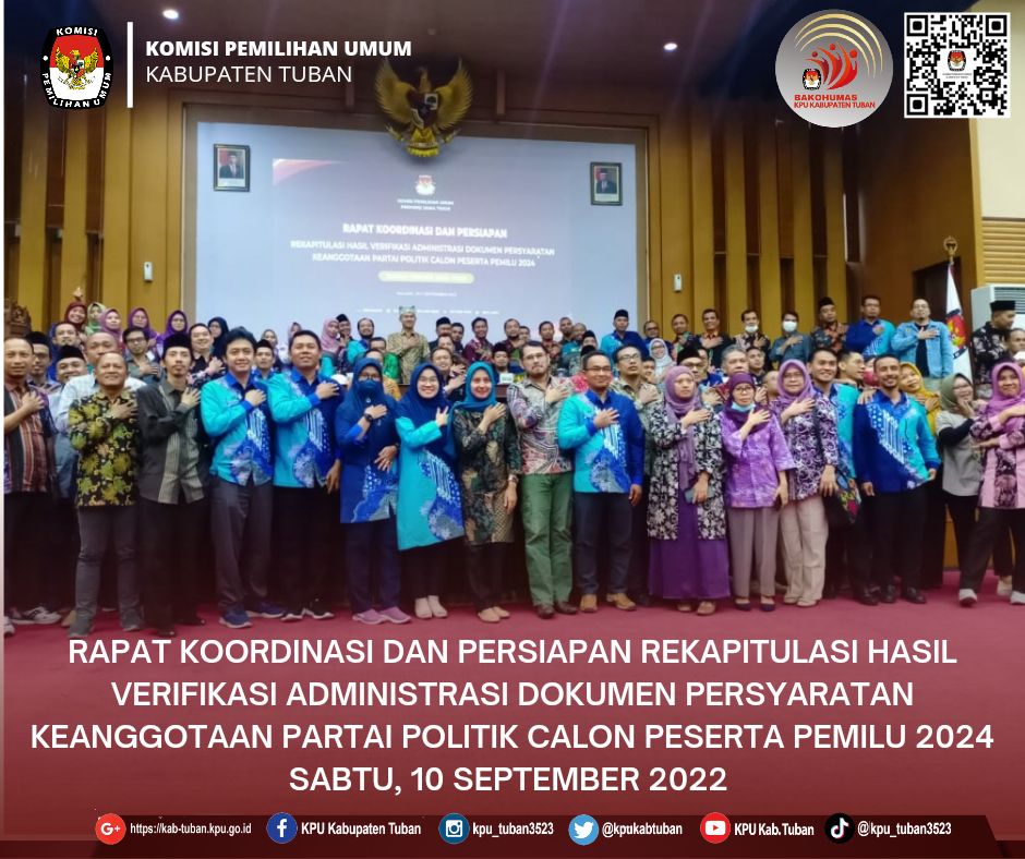Malang, kab-tuban.kpu.go.id - 38 KPU Kabupaten/Kota se-Jawa Timur menghadiri pembukaan acara Rapat Koordinasi dan Persiapan Rekapitulasi Hasil Verifikasi Administrasi Dokumen Persyaratan Keanggotaan Partai Politik Calon Peserta Pemilu 2024 yang berlangsung Sabtu siang (10/09/2022).