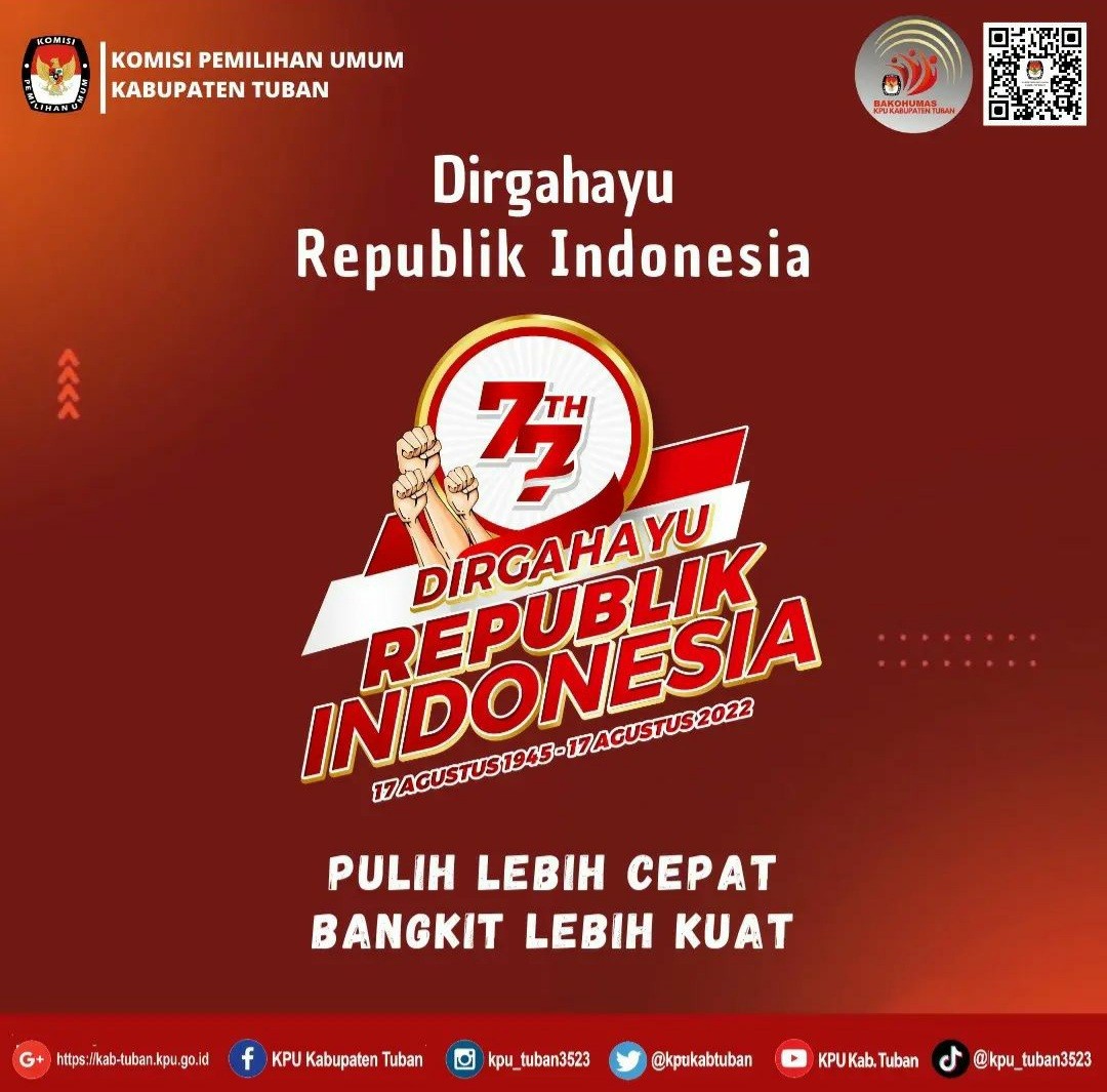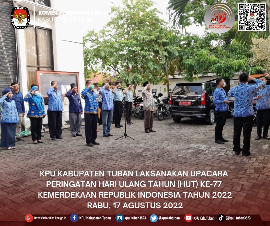 Tuban, kab-tuban.kpu.go.id - Rabu pagi (17/08/2022), jajaran KPU Kabupaten Tuban melaksanakan Upacara Peringatan Hari Ulang Tahun (HUT) Ke-77 Kemerdekaan Republik Indonesia di halaman kantor KPU Kabupaten Tuban, Jalan Pramuka Nomor 3, Sidorejo, Tuban.