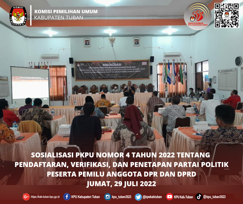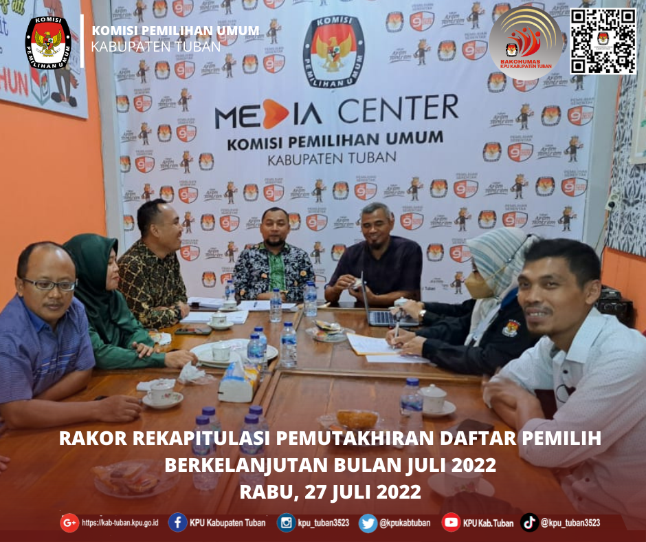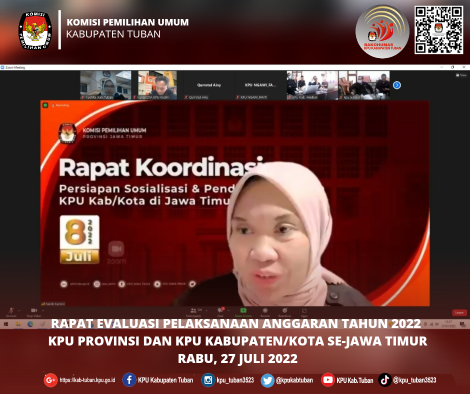 Tuban, kab-tuban.kpu.go.id - Sekretaris KPU Kabupaten Tuban, Mochamad Arifuddin, Kepala Sub Bagian Perencanaan, Data, dan Informasi, Fitri Maharani Yudhita, dan Operator Sakti KPU Kabupaten Tuban, Astri Sri Utami, mengikuti kegiatan Rapat Evaluasi Pelaksanaan Anggaran Tahun 2022 KPU Provinsi dan KPU Kabupaten/Kota se-Jawa Timur, Rabu (27/07/2022), secara virtual.
