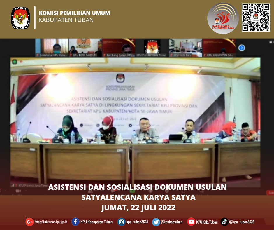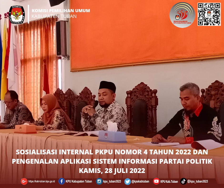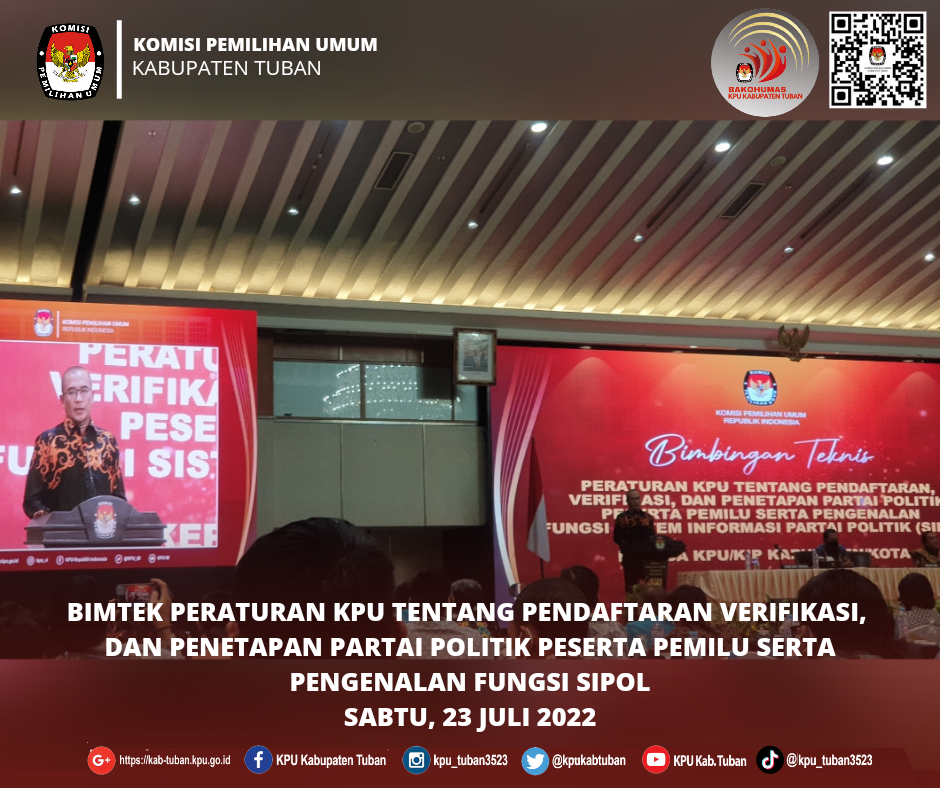 Tuban, kab-tuban.kpu.go.id - Sebagai upaya menyamakan persepsi dan memberikan pemahaman regulasi dan kebijakan tentang pendaftaran, verifikasi, dan penetapan partai politik peserta Pemilu serta pengenalan fungsi Sistem Informasi Partai Politik (Sipol), KPU RI menyelenggarakan Bimbingan Teknis (Bimtek) selama 3 (tiga) hari (23-25/07/2022).
