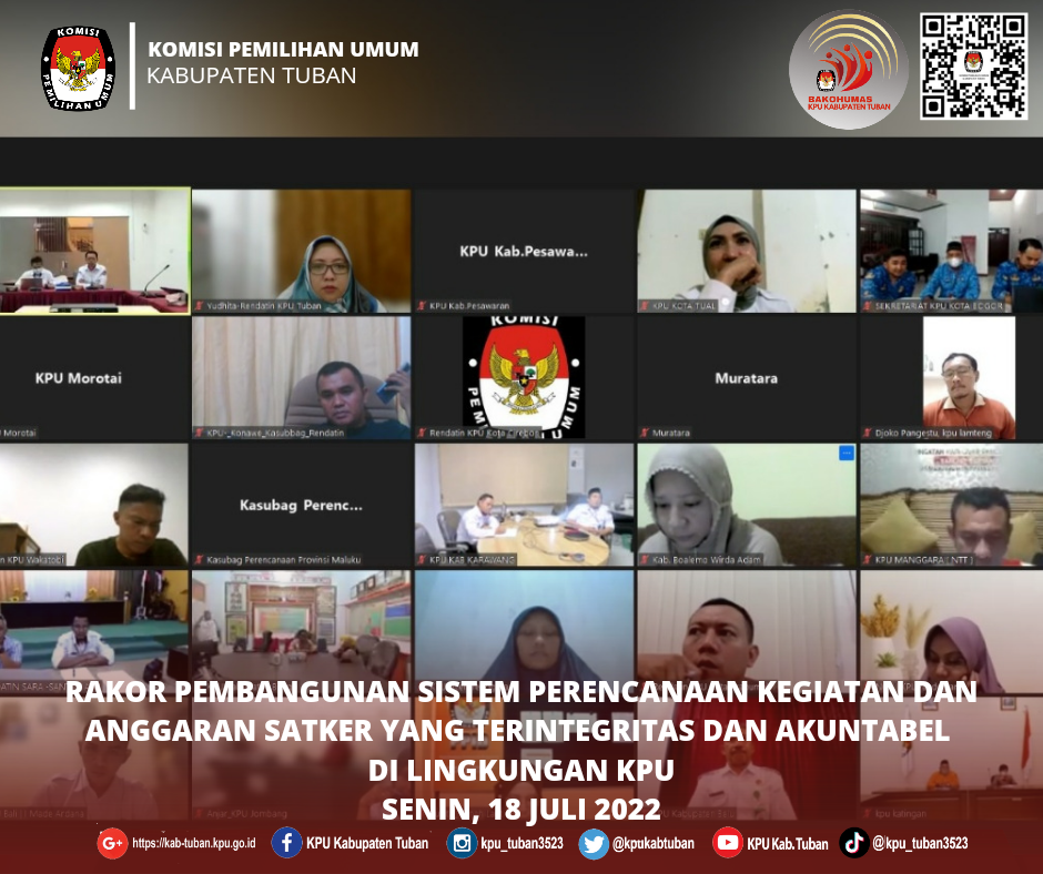 Tuban, kab-tuban.kpu.go.id Senin malam (19/07/2022), dalam Rapat Koordinasi (Rakor) Pembangunan Sistem Perencanaan Kegiatan dan Anggaran Satuan Kerja (Satker) yang Terintegritas dan Akuntabel di Lingkungan KPU secara daring Kepala Biro Perencanaan dan Organisasi Sekretariat Jenderal KPU RI, Suryadi, menegaskan bahwa pelaksanaan kegiatan dan realisasi anggaran yang menjadi Prioritas Nasional (Anggaran Tahapan Pemilu 2024) dilaksanakan secara tertib, efisien, dan sesuai dengan petunjuk teknis dari KPU RI.