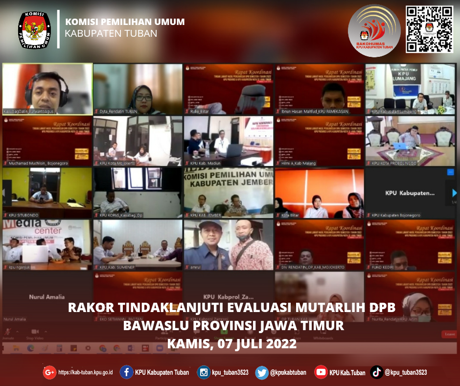 Tuban, kab-tuban.kpu.go.id - Tim Perencanaan Data dan Informasi (Rendatin) KPU Kabupaten Tuban mengikuti undangan KPU Provinsi Jawa Timur dalam Rapat Koordinasi Tindak Lanjut Hasil Pengawasan DPB Semester I Tahun 2022 secara daring bersama seluruh satuan kerja KPU Kabupaten/Kota, Kamis (07/07/2022), mulai pukul 13.30 WIB sampai selesai. Hadir Divisi Rendatin, Moch. Nurokhib, Kasubbag Rendatin, Fitri Maharani Yudhita, dan Operator Sidalih, Saila Amaliya. Ketua KPU Provinsi Jawa Timur, Choirul Anam, menegaskan bahwa Badan Pengawas Pemilu (Bawaslu) adalah mitra kerja KPU. Maka KPU perlu menjalin hubungan kemitraan yang baik termasuk menindaklanjuti hasil evaluasi Bawaslu dalam kegiatan KPU. Salah satu tugasnya adalah mengawasi kegiatan pemutakhiran data pemilih "Apalagi mutarlih adalah salah satu kegiatan unggulan KPU karena kegiatan ini berlangsung terus menerus atau disebut berkelanjutan baik itu ketika tidak ada Tahapan Pemilu," ujar Anam. Ketua Divisi Rendatin KPU Provinsi Jawa Timur, Nurul Amalia, mengharapkan kepada Tim Rendatin KPU se-Jawa Timur agar menjadikan evaluasi Bawaslu sebagai penambah semangat dan meningkatkan kinerja dalam menjalankan tugas pemutakhiran data pemilih dengan sebaik-baiknya. Kelengkapan dokumen dalam kegiatan pemutakhiran data pemilih agar dilakukan secara cermat dan teliti terutama dokumen yang disampaikan kepada Bawaslu. Selanjutnya Nurul Amalia melakukan evaluasi kepada masing-masing KPU Kabupaten/Kota yang ditemukan permasalahan terkait evaluasi Bawaslu Provinsi Jawa Timur berikut jawaban yang diberikan atas permasalahan tersebut. Khusus untuk KPU Kabupaten Tuban, tidak mendapat banyak evaluasi dari Bawaslu Provinsi Jawa Timur, karena pada waktu sebelumnya, setiap masukan dari Bawaslu Kabupaten Tuban sudah langsung ditindaklanjuti. "Saran dari KPU Provinsi Jawa Timur terutama untuk penertiban pengarsipan dokumen mutarlih yang disampaikan ke Bawaslu misalnya ada tanda terima dan diarsipkan baik manual atau digital, kami sangat perhatikan dan kami tindaklanjuti," tegas Moch. Nurokhib, Komandan Tim Rendatin KPU Kabupaten Tuban. (dy/humas)