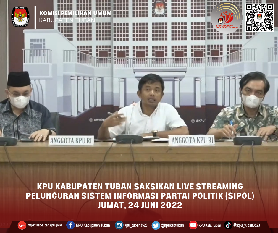 Tuban, kab-tuban.kpu.go.id - Jumat siang (24/6/2022), KPU RI gelar Peluncuran Sistem Informasi Partai Politik (Sipol) dan Konferensi Pers yang disiarkan live streaming melalui channel youtube KPU RI dilink https://youtu.be/LkuE7QO4Sps Perwakilan KPU Kabupaten Tuban yang diwakili Divisi Teknis Penyelenggaraan, Nur Hakim beserta Kasubbag Teknis Penyelenggaraan Pemilu, Partisipasi dan Hubungan Masyarakat, Endang Sri Arti Rahayu dan staf, Mohammad Ali Fikri mengikuti kegiatan yang diselenggarakan secara hybrid oleh KPU RI. Acara tersebut dibuka oleh Ketua Divisi Teknis Penyelenggaraan, Idham Holik. Dalam pembukaannya beliau menyampaikan bahwa dalam waktu dekat, KPU RI akan melaksanakan Tahapan Pemilu yaitu Pendaftaran Partai Politik yang akan dilaksanakan dalam 135 hari, yang akan dimulai pada tanggal 29 Juli 2022 sampai dengan 13 Desember 2022. Sedangkan Penetapan Peserta Pemilu pada tanggal 14 Desember 2022. Selain itu, aplikasi Sistem Informasi Partai Politik (Sipol) akan menjadi alat bantu yang akan digunakan. "Pada tanggal 29 Juli 2022 tahapan pendaftaran dan verifikasi Partai Politik akan dimulai. Tahapan tersebut akan dilaksanakan selama 135 hari. Pada tanggal 14 Desember 2022 KPU akan menetapkan Peserta Pemilu. Dalam pelaksanaan tahapan tersebut, KPU akan dibantu dengan aplikasi Sipol. Aplikasi ini dapat diakses oleh Partai Politik dan KPU di berbagai tingkatan. Aplikasi ini dapat diakses melalui sipol.kpu.go.id dan tentang tata cara/juknis (petunjuk teknis) pemakaian aplikasi tersebut akan disampaikan melalui website resmi KPU RI, yaitu kpu.go.id," ujar pria yang akrab dipanggil Pak Idham ini. (af/humas)