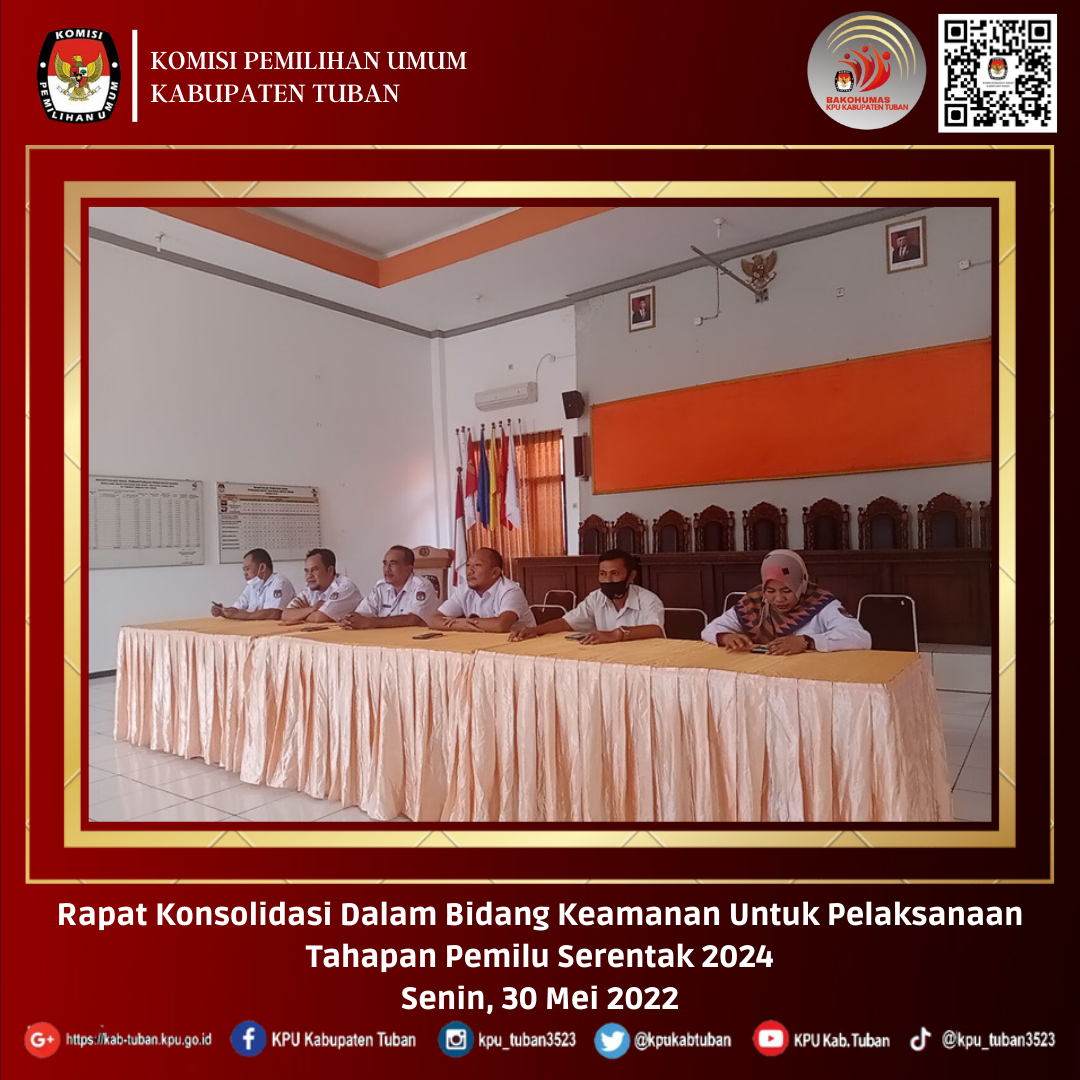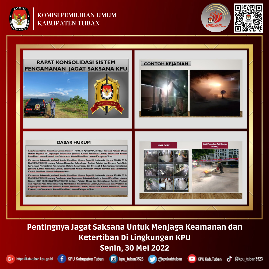Tuban, kab-tuban.kpu.go.id - Menjelang akan dilaksanakannya tahapan Pemilu Serentak Nasional Tahun 2024, KPU Provinsi Jawa Timur menginisiasi Rapat Konsolidasi Sistem Pengamanan Dalam (Jagat Saksana) Tahun 2022 yang diikuti oleh 38 KPU Kabupaten/Kota se-Jawa Timur. Satuan Pengamanan dari KPU Kabupaten Tuban yang turut hadir dalam Rapat Konsolidasi ini adalah Muhammad Nur, Ali Mansur, Budi Widarto, dan Sugihandoyo yang didampingi Sekretaris, Mochamad Arifuddin dan Kasubbag Keuangan, Umum, dan Logistik, Rizki Yulli Indahsari. Kepala Bagian Pengamanan Dalam (Jagat Saksana) KPU, Ashari yang didapuk menjadi narasumber menyampaikan pentingnya sebuah pengamanan di lingkungan KPU baik di KPU Provinsi, dam KPU Kabupaten/Kota di seluruh Indonesia menjelang akan dilaksanakannya Tahpan Penyelenggaraan Pemilu Serentak Nasional Tahun 2024. "Suksesnya penyelenggaran Pemilu maupun Pemilihan tidak terlepas dari solid dan kompaknya Petugas Keamanan," ungkapnya. Lebih lanjut Kabag Pamdal (Jagat Saksana) KPU RI tersebut mengatakan agar terciptanya situasi yang kondusif dan untuk mendeteksi awal dari sebuah kejadian yang perlu diperhatikan adalah siapapun yang memasuki kantor harus mengisi Buku Tamu dan selalu melakukan filter siapa saja yang akan memasuki area kantor serta selalu mencatat apapun yang terjadi di kantor di buku Laporan Kejadian," jelasnya. "Yang paling utama adalah soliditas dan kekompakkan Petugas Keamanan internal yang diaplikasikan dengan mengisi Buku Mutasi atau Serah Terima Tugas Jaga," jelasnya kembali. (noor/humas)