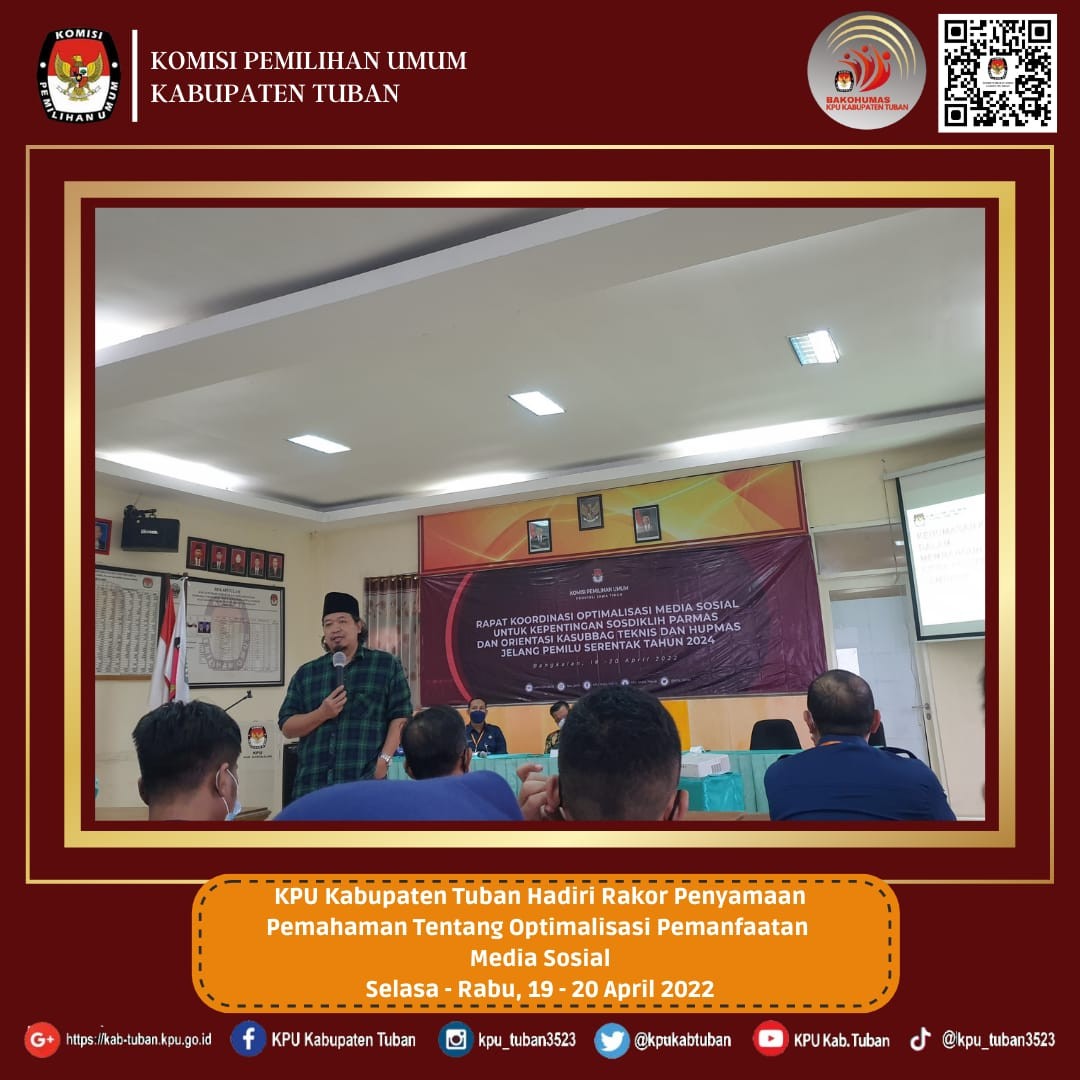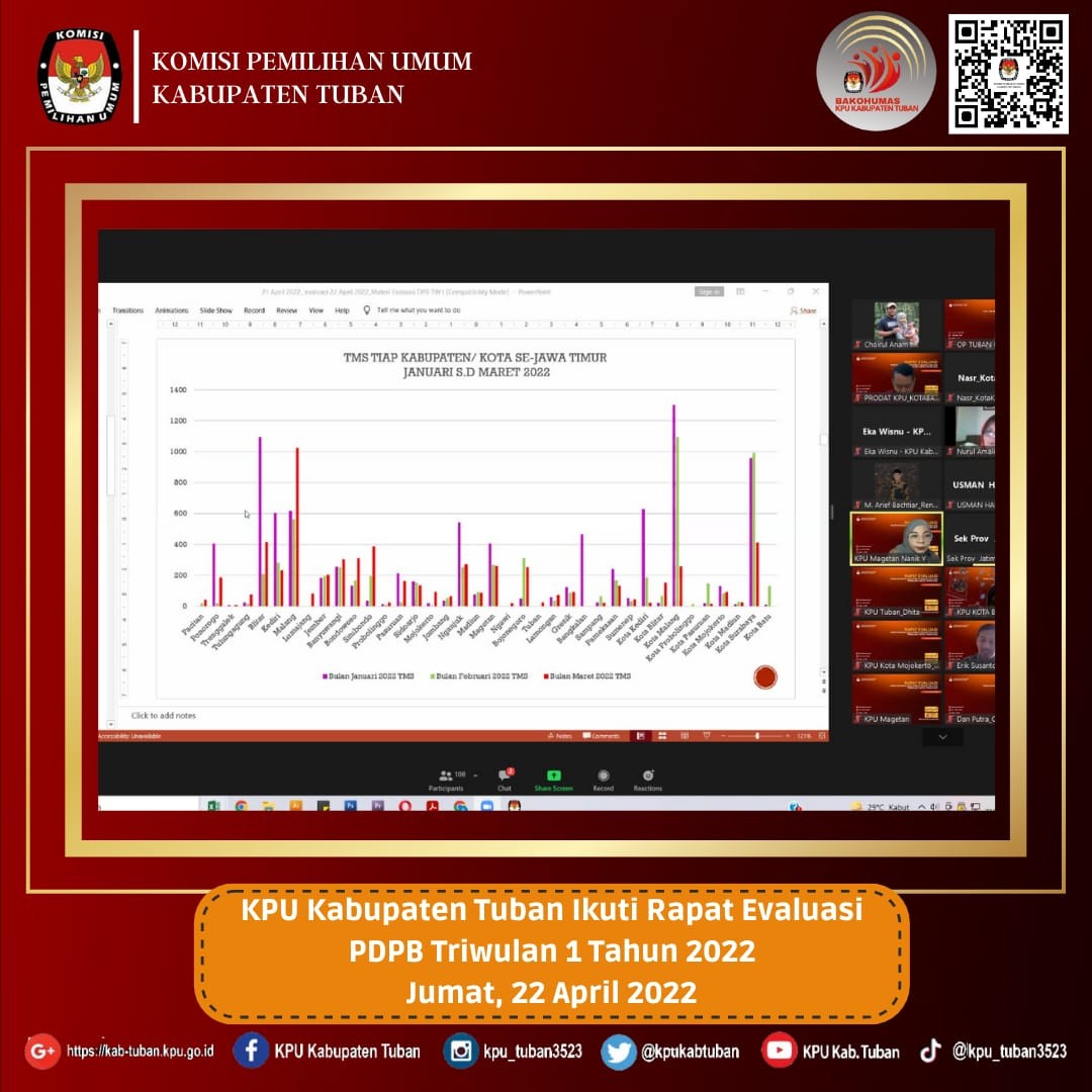 Tuban, kab-tuban.kpu.go.id - Jumat pagi (22/04/2022), perwakilan dari KPU Kabupaten Tuban mengikuti Pelaksanaan Rapat Evaluasi PDPB Triwulan 1 Tahun 2022 yang diselenggarakan KPU Provinsi Jawa Timur. Divisi Perencanaan, Data, dan Informasi, Muh. Nurrokib, Kasubag Perencataan, Data dan Informasi, Fitri Maharani Yudhita, beserta staf, Saila Amaliya mengikuti kegiatan yang dilaksanakan secara hybrid ini. Kegiatan ini dipimpin langsung oleh Divisi Perencanaan, Data, dan Informasi KPU Provinsi Jawa Timur, Nurul Amalia. Dalam pembukaannya perempuan yang pernah menjabat sebagai Anggota KPU Kota Surabaya tersebut menghimbau kepada seluruh KPU Kabupaten/Kota yang ada di wilayah kerja Provinsi Jawa Timur untuk lebih memaksimalkan proses Pemutakhiran Daftar Pemilih Berkelanjutan (PDPB). “Kegiatan ini dilakukan untuk melakukan evaluasi terkait peningkatan data pemilih baru dan data pemilih yang tidak memenuhi syarat (TMS). KPU Provinsi Jawa Timur juga mengapresiasi KPU Kabupaten/Kota se-Jatim yang telah melakukan pemetaan TPS, hal ini dilakukan supaya KPU Kabupaten/Kota di Jatim sudah siap terkait data yang akan digunakan dalam penentuan Data Pemilih Tetap (DPT) dalam Pemilu Serentak 2024," jelasnya. "Dalam kegiatan ini KPU Provinsi Jawa Timur menghimbau KPU Kabupaten/Kota di Jatim untuk melibatkan masyarakat secara langsung dalam update data pemilih, yang dapat dilakukan secara online/offline,” ujar wanita yang akrab di panggil Bu Nurul. (af/humas)
