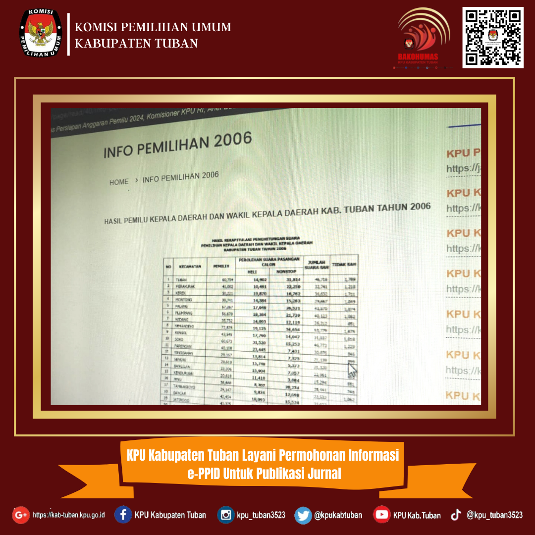 Tuban, kab-tuban.kpu.go.id - Senin pagi (11/04/2022), KPU Kabupaten Tuban melalui PPID (Pejabat Pengelola Informasi dan Dokumentasi) melayani permohonan informasi e-PPID yang diajukan oleh Aditya Putra Prathama. Permohonan informasi yang diajukan oleh Aditya terkait Data Pemilih dalam Pemilihan Bupati dan Wakil Bupati Tahun 2006. "Informasi yang saya ajukan akan digunakan untuk publikasi jurnal dengan topik efektivitas dan efisiensi Pilkada di Indonesia," ujar pria kelahiran Jakarta tersebut. Lebih lanjut, Aditya mengucapkan terima kasih kepada KPU Kabupaten Tuban atas pelayanan yang diberikan. "Terima kasih kepada KPU Kabupaten Tuban telah memberikan informasi terkait Pilkada yang dilaksanakan pada tahun 2006. Apresiasi kepada KPU Kabupaten Tuban karena dapat memberikan informasi dengan cepat dan tepat. Terima kasih," ujarnya kembali. Sementara itu, Kasubbag Teknis Penyelenggaraan Pemilu, Partisipasi, dan Hubungan Masyarakat, Endang Sri Arti Rahayu menyampaikan PPID KPU Kabupaten Tuban tidak hanya melayani Permohonon Informasi yang datang langsung namun juga bisa memanfaatkan e-PPID. "e-PPID menjadi salah satu instrumen yang bisa digunakan oleh Pemohon Informasi yang tidak bisa datang langsung ke kantor KPU Kabupaten Tuban seperti Mas Aditya yang berdomisili di DKI Jakarta," jelas perempuan yang secara ex officio juga merangkap sebagai PPID ini. (humas)