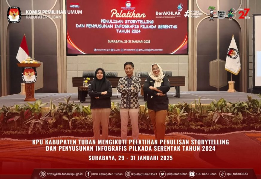 Tuban, kab-tuban.kpu.go.id – Kepala Divisi Perencanaan, Data, dan Informasi dan Kepala Sub Bagian Perencanaan, Data, dan Informasi beserta Pelaksana KPU Kabupaten Tuban, mengikuti Pelatihan Penulisan Storytelling dan Penyusunan Infografis Pilkada Serentak Tahun 2024, Rabu (29/1) sampai Jumat (31/1) di Surabaya. Selama tiga hari, peserta mendapat pelatihan tentang bagaimana menyampaikan peristiwa-peristiwa dalam tahapan Pilkada 2024 dalam ranah kegiatan pada divisi Rendatin dalam konsep penulisan bertutur atau dikenal dengan storytelling dan infografis dengan teknik visualisasi data.