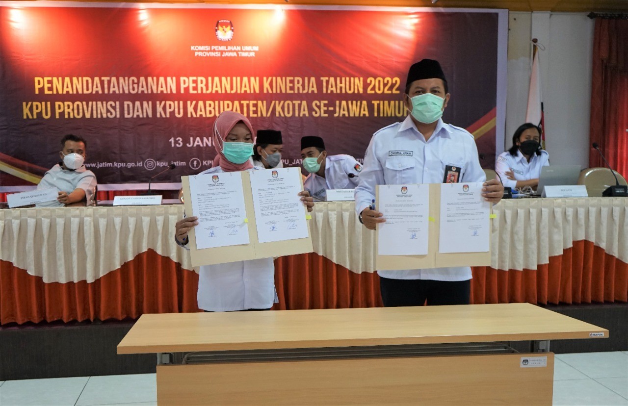 Ketua KPU Jatim, Choirul Anam dalam sambutannya menyebutkan Perjanjian Kinerja ini merupakan deklarasi janji kerja yang perlu dimaksimalkan, tidak hanya menjadi rutinitas dan seremonial belaka, tetapi harus diaktualisasikan dan menjadi target kerja di tahun 2022.
