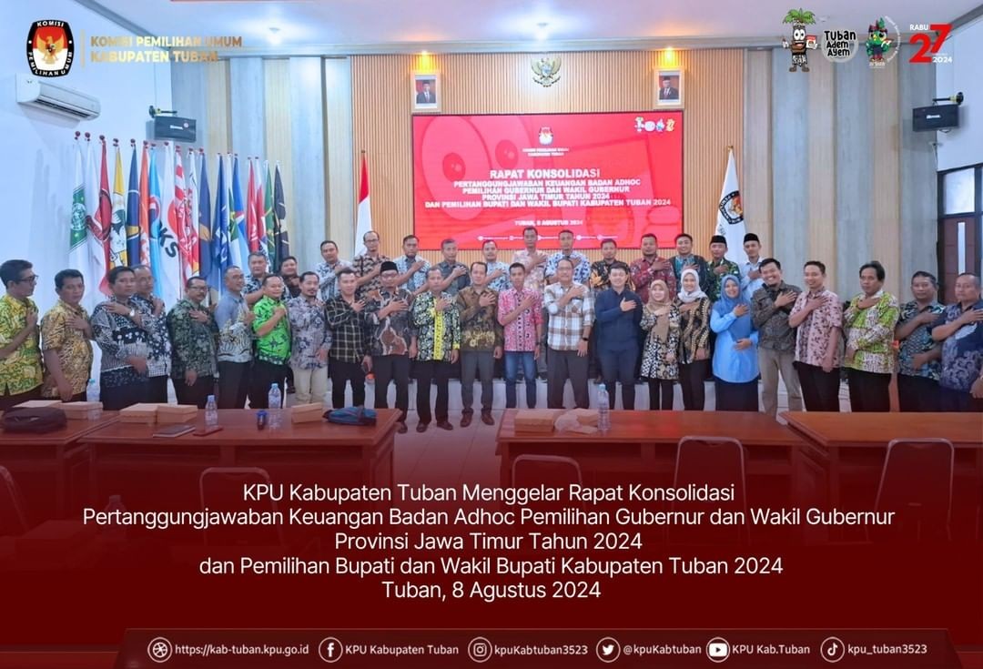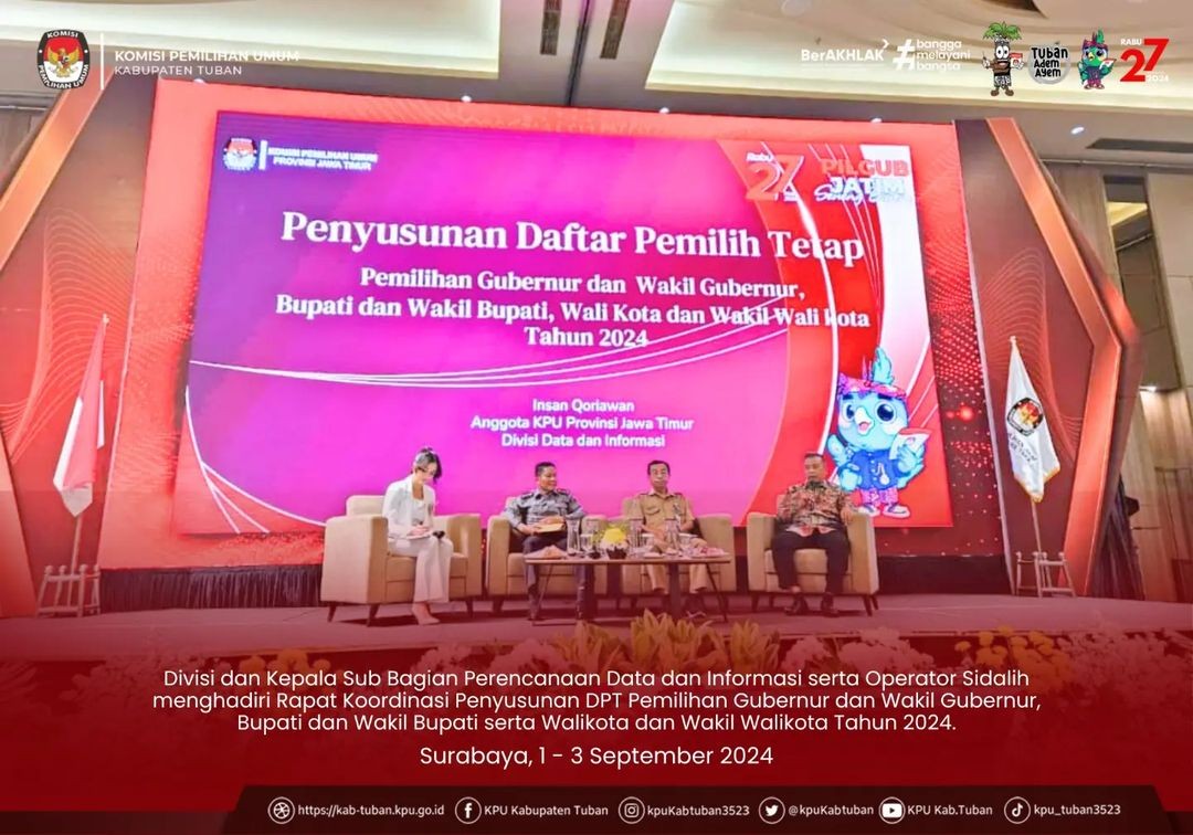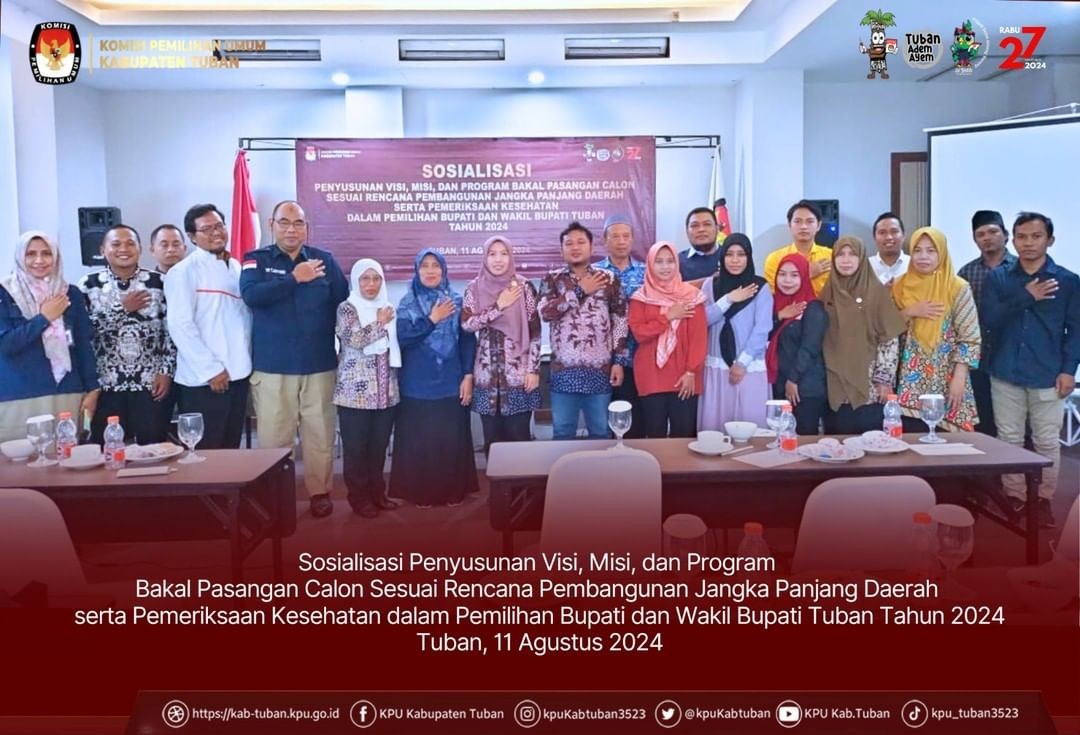 Tuban, kab-tuban.kpu.go.id - Minggu (11/8/2024) KPU Kabupaten Tuban menggelar Sosialisasi Penyusunan Visi, Misi, dan Program Bakal Pasangan Calon Sesuai Rencana Pembangunan Jangka Panjang Daerah (RPJPD) serta Pemeriksaan Kesehatan dalam Pemilihan Bupati dan Wakil Bupati Tuban Tahun 2024.