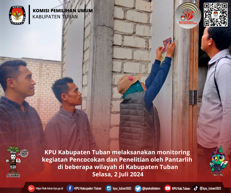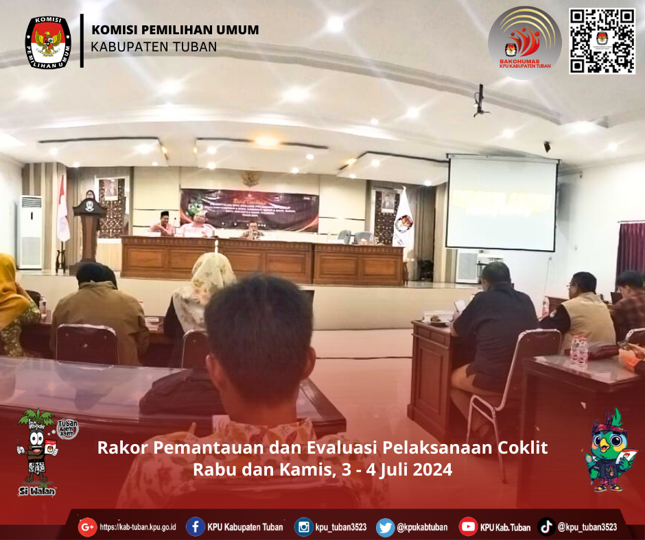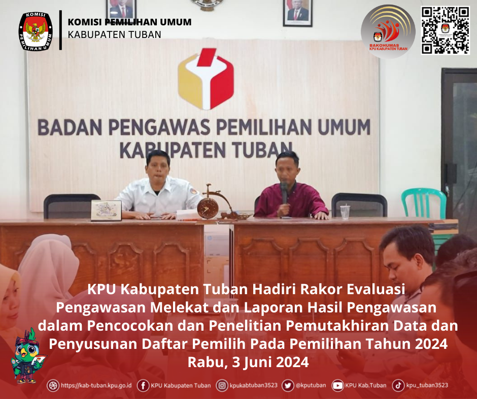 Tuban, kab-tuban.kpu.go.id - KPU Kabupaten Tuban menghadiri undangan Bawaslu Tuban pada hari Rabu (3/7/2024) pukul 13.00 WIB di Kantor Bawaslu, Jl. Pramuka No. 5, Tuban. Anggota KPU Kabupaten Tuban, Agus Umar Faruq yang membidangi Divisi Hukum dan Pengawasan hadir dalam kegiatan yang bertujuan untuk evaluasi pengawasan melekat dan laporan hasil pengawasan dalam pencocokan dan penelitian pemutakhiran data dan penyusunan daftar pemilih pada Pemilihan tahun 2024, sehingga kualitas daftar pemilih tetap terjaga. "Coklit merupakan akronim dari “Pencocokan dan Penelitian” yang artinya kegiatan ini untuk mencocokan data pemilih KPU hasil sinkronisasi DP4 (Daftar Penduduk Potensial Pemilih Pemilu) + DPT (Daftar Pemilih Tetap) pemilu terakhir dengan dokumen pemilih/warga. Kegiatan ini dilakukan oleh Petugas Pemutakhiran Data Pemilih(PPDP) atau disebut Pantarlih," jelas pria yang berdomisili di Singgahan tersebut. "Kegiatan ini dilaksanakan 24 Juni 2024 s.d. 24 Juli 2024. Adapun dokumen yang disiapkan oleh masyarakat yaitu KTP elektronik/KK/biodata penduduk/IKD, (Identitas Kependudukan Digital)," jelasnya. Sementara itu, Selasa (2/7/2024), KPU Kabupaten Tuban telah melakukan monitoring ke beberapa wilayah yang meliputi Kecamatan Rengel, Grabagan, Soko, Parengan, Tuban, Semanding, Widang, Palang, Montong, dan Singgahan. (bfc/humas)