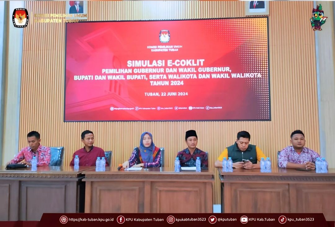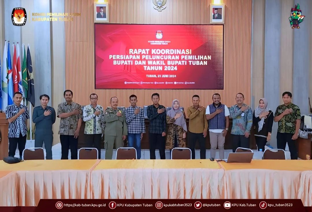kab-tuban.go.id - Tuban, Jumat siang (21/6/2024), KPU Kabupaten Tuban bersama Polres Tuban, Kodim 0811 Tuban, Organisasi Perangkat Daerah (OPD), dan pihak terkait lainnya menggelar Rapat Koordinasi Persiapan Peluncuran Pemilihan Bupati dan Wakil Bupati Tuban Tahun 2024 di Aula Lantai 2 Kantor KPU Kabupaten Tuban, Jalan Pramuka Nomor 3, Sidorejo, Tuban.