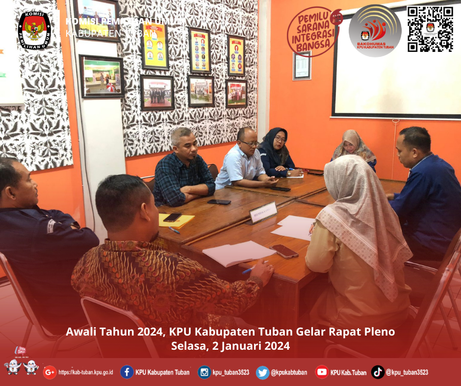 Tuban, kab-tuban.kpu.go.id - Mengawali Tahun 2024, KPU Kabupaten Tuban mengadakan Rapat Pleno rutin pada Selasa (2/1/2024), pukul 10.00 WIB sampai selesai.