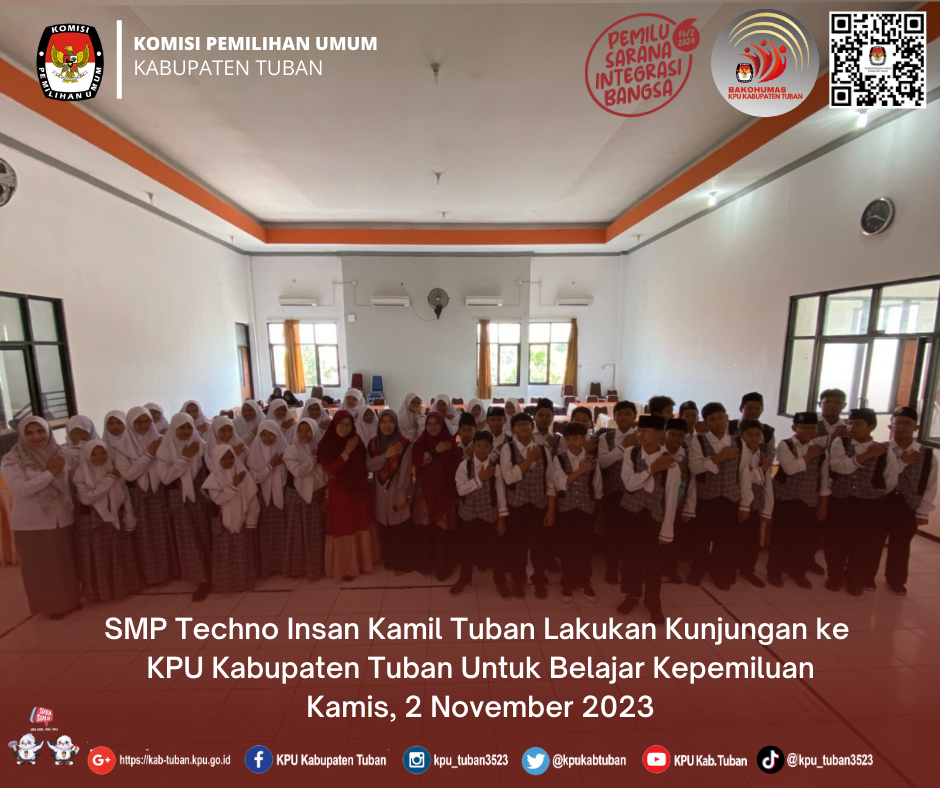 Tuban, kab-tuban.kpu.go.id - Sekitar 40 siswa-siswi SMP Techno Insan Kamil Tuban melaksanakan kunjungan ke kantor KPU Kabupaten Tuban untuk belajar tentang pemilu dan demokrasi. Kegiatan ini dilaksanakan pada Kamis (2/11/2023) bertempat di Aula Lantai 2 Kantor KPU Kabupaten Tuban, Jalan Pramuka Nomor 3, Sidorejo, Tuban. Para pelajar tersebut disambut oleh Anggota KPU Kabupaten Tuban yang membidangi Divisi Sosialisasi, Pendidikan Pemilih, Partisipasi Masyarakat, dan SDM, Zakiyatul Munawaroh. Perempuan yang akrab dipanggil Bu Zakiyah ini menyampaikan bahwa Pemilu akan dilaksanakan pada tanggal 14 Februari 2024. "Hari Rabu tanggal 14 Februari 2024 akan dilaksanakan Pemilu Tahun 2024 dan saat ini ada beberapa tahapan yang sedang berjalan. Diantaranya adalah Penetapan DCT dan persiapan untuk Tahapan Kampanye. Adik-adik dapat mengikuti kegiatan yang sedang dilaksanakan oleh KPU Kabupeten Tuban dengan meng-follow akun media sosial KPU Kabupaten Tuban seperti Instagram, Facebook, Twitter, Youtube, dan Tiktok," jelasnya. "Apabila nanti sudah berusia 17 tahun untuk segera mengurus KTP dan masuk dalam data pemilih. Apabila sudah masuk kedalam data pemilih maka teman-teman pelajar dari SMP Techno Insan Kamil Tuban dapat menggunakan hak pilihnya untuk memilih pemimpin untuk negara kita," ujarnya kembali. Setelah pemaparan materi para pelajar diajak untuk mengunjungi Rumah Pintar Pemilu yang dimiliki oleh KPU Kabupaten Tuban. (al/humas)
