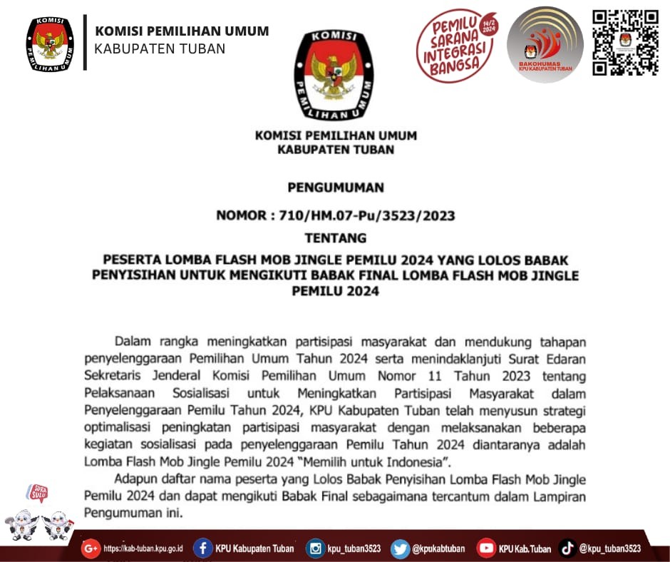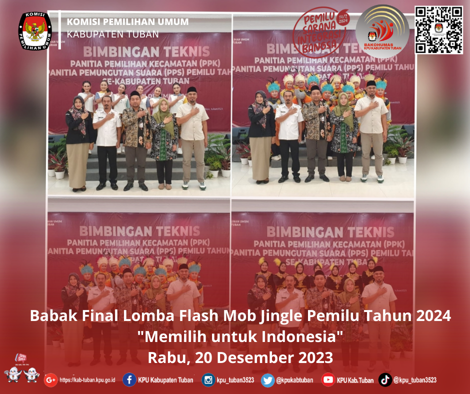 Babak Final Flash Mob Jingle Pemilu 2024 dilaksanakan setelah seremonial pembukaan Bimbingan Teknis Panitia Pemilihan Kecamatan (PPK) dan Panitia Pemungutan Suara (PPS) se-Kabupaten Tuban berlangsung.