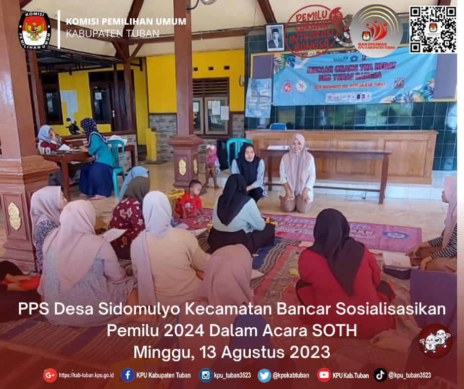 Tuban, kab-tuban.kpu.go.id - Minggu, (13/08/2023), Anggota PPS Desa Sidomulyo melaksanakan Sosialisasi Tahapan Pemilu 2024 , sosialisasi tersebut dihadiri oleh 25 ibu ibu yang tergabung dalam acara Sekolah Orang Tua Hebat ( SOTH). Sosialisasi tersebut dilakukan di Balaidesa desa Sidomulyo kecamatan bancar. Anggota panitia pemungutan suara (PPS) Desa Sidomulyo yang membidangi bagian Data dan SDM ikut berpartisipasi dalam sosialisasi tersebut. Anggota PPS Bagian Data menyampaikan Tahapan Pemilu saat ini , yaitu pelayanan terhadap pemilih yang akan pindah memilih karena alasan tertentu, misalkan kerja yg tidak bisa ditinggalkan pada saat nanti memilih ditempat tersebut dan harus memilih ditempat kerja, kuliah yg tidak bsa ditinggalkan atau pindah domisili pada saat ini dan bisa mengajukan ke PPS bagian data dg syarat syarat dan bukti otentik. Selanjutnya materi disampaikan oleh Mbak Maryam selaku bidang SDM menjelaskan bahwa pemilu 2024 akan berhasil krna adanya partisipasi masyarakat, diharapkan setelah sosialisasi ini bisa menyampaikan hasil yg didapat ke tetangga terdekat maupun ke saudara supaya informasi tentang pemilu sudah terdengar byk Khalayak umum. jangan lupa juga nanti akan ada informasi terkait pendaftaran kpps sesuai dg TPS masing-masing dg syarat dan ketentuan tertentu, tunggu saja informasi nya dan lengkapi berkas nya bagi yg memenuhi syarat. Disampaikan pula bahwa bagi yg punya akun Ig bisa akses ig PPS Desa Sidomulyo supaya kalau ada informasi apapun bisa langsung dilihat diig. Dan Berita resmi bisa diakses melalui Ig KPU kabupaten Tuban. Supaya masyarakat lebih tahu dan antusias untuk datang ke TPS masing-masing ditgl 14 Februari 2024 mendatang. "Jangan lupa tgl 14 Februari 2024 hari Rabu datang ke TPS , karena satu suara anda menentukan masa depan Bangsa" ucap Mbak Yam (ep/humas)