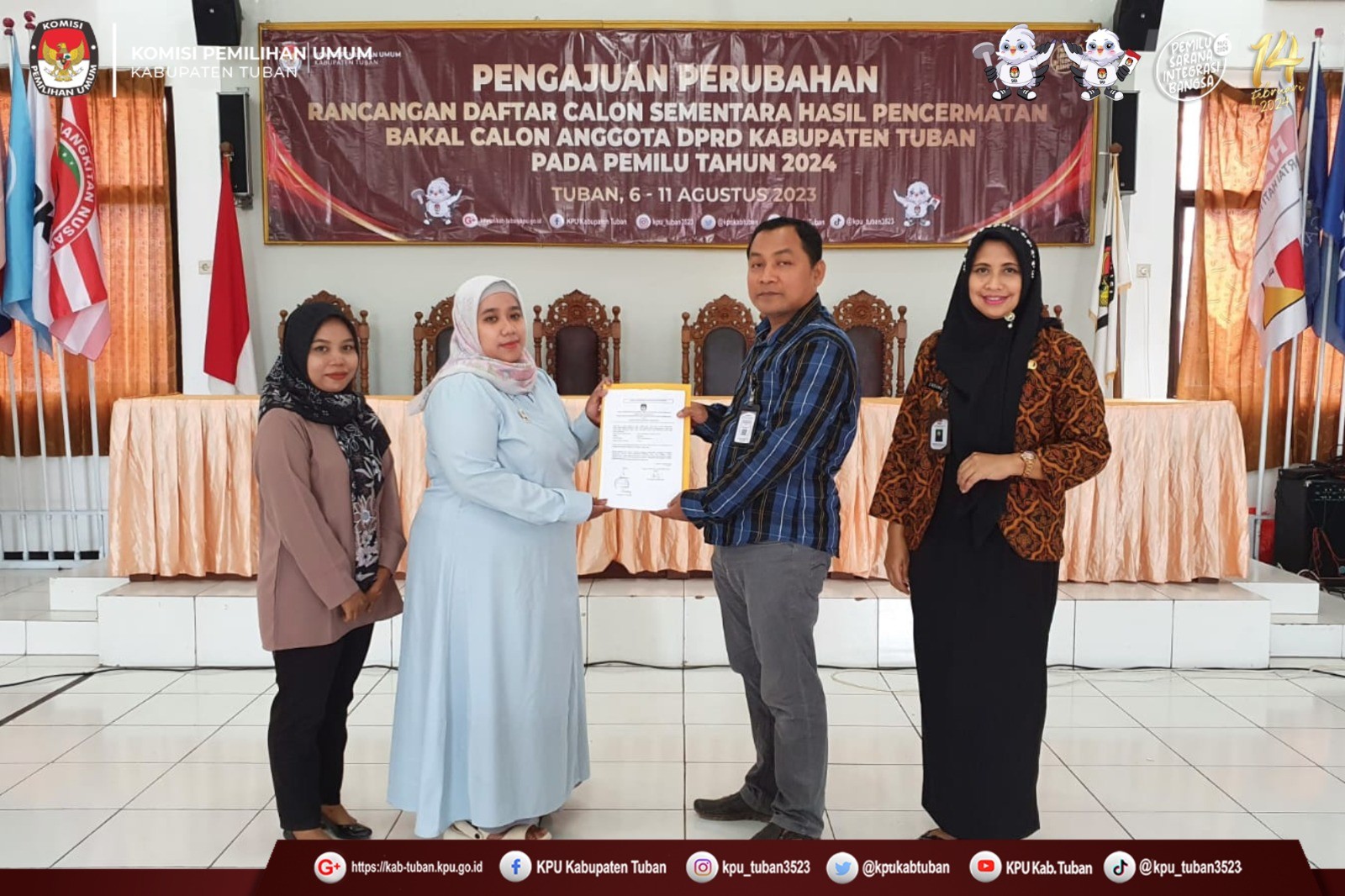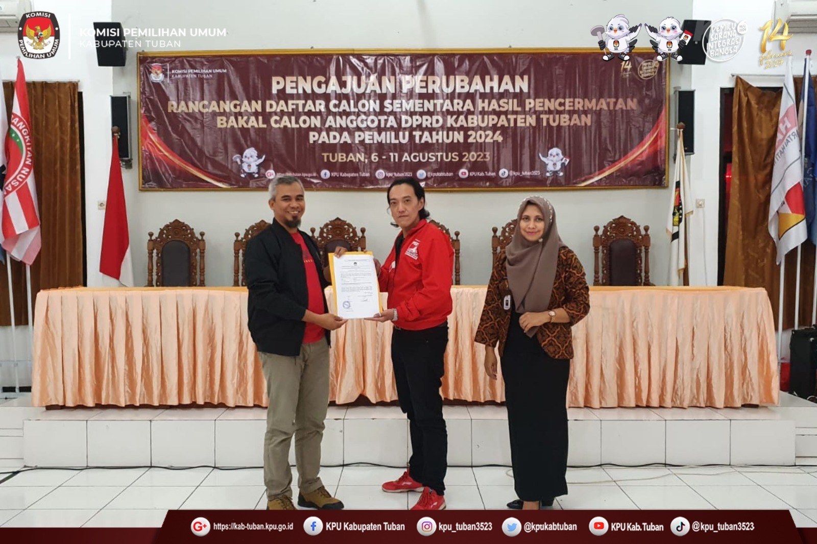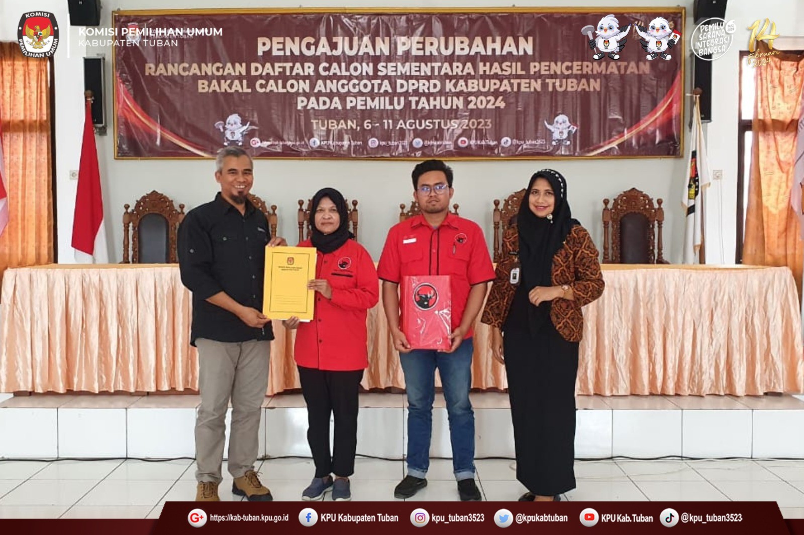 Tuban, kab-tuban.kpu.go.id - Jumat (11/8/2023), KPU Kabupaten Tuban menerima Pengajuan Perubahan Bakal Calon Anggota DPRD Kabupaten Tuban Pemilu Tahun 2024 pada Masa Pencermatan Rancangan Daftar Calon Sementara (DCS) dari Partai Demokrasi Indonesia Perjuangan (PDI Perjuangan). (humas)