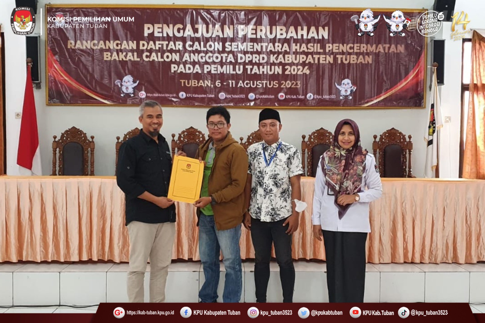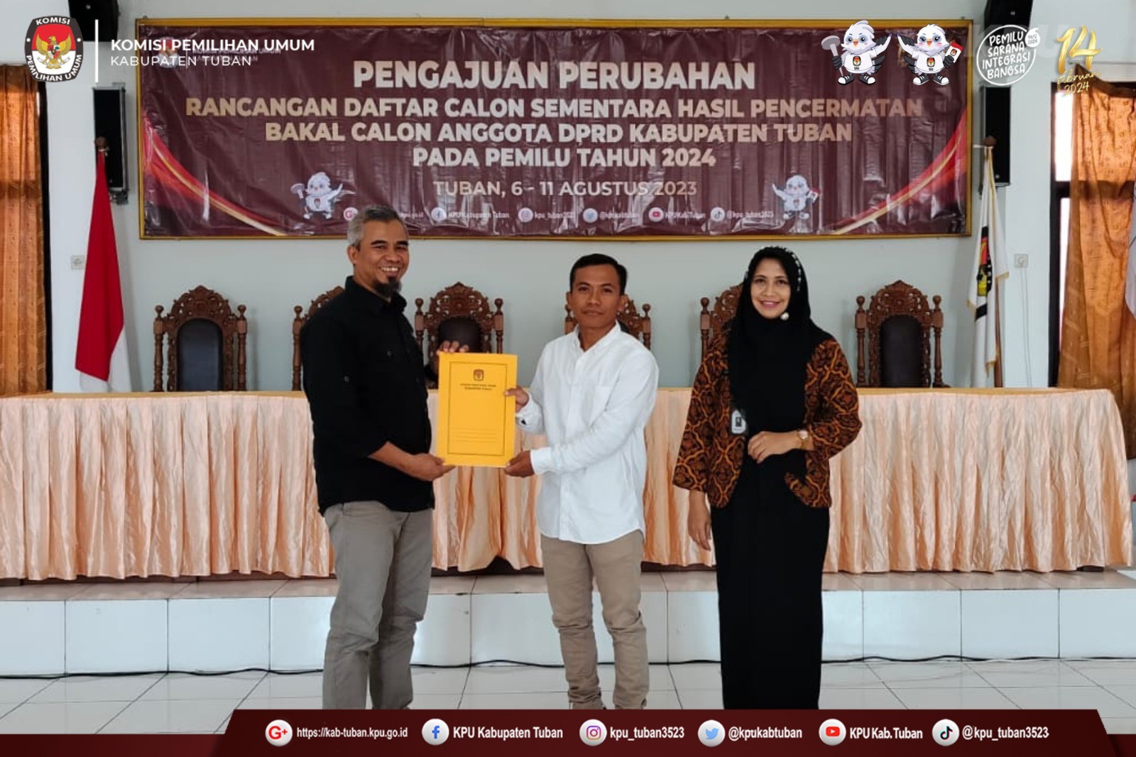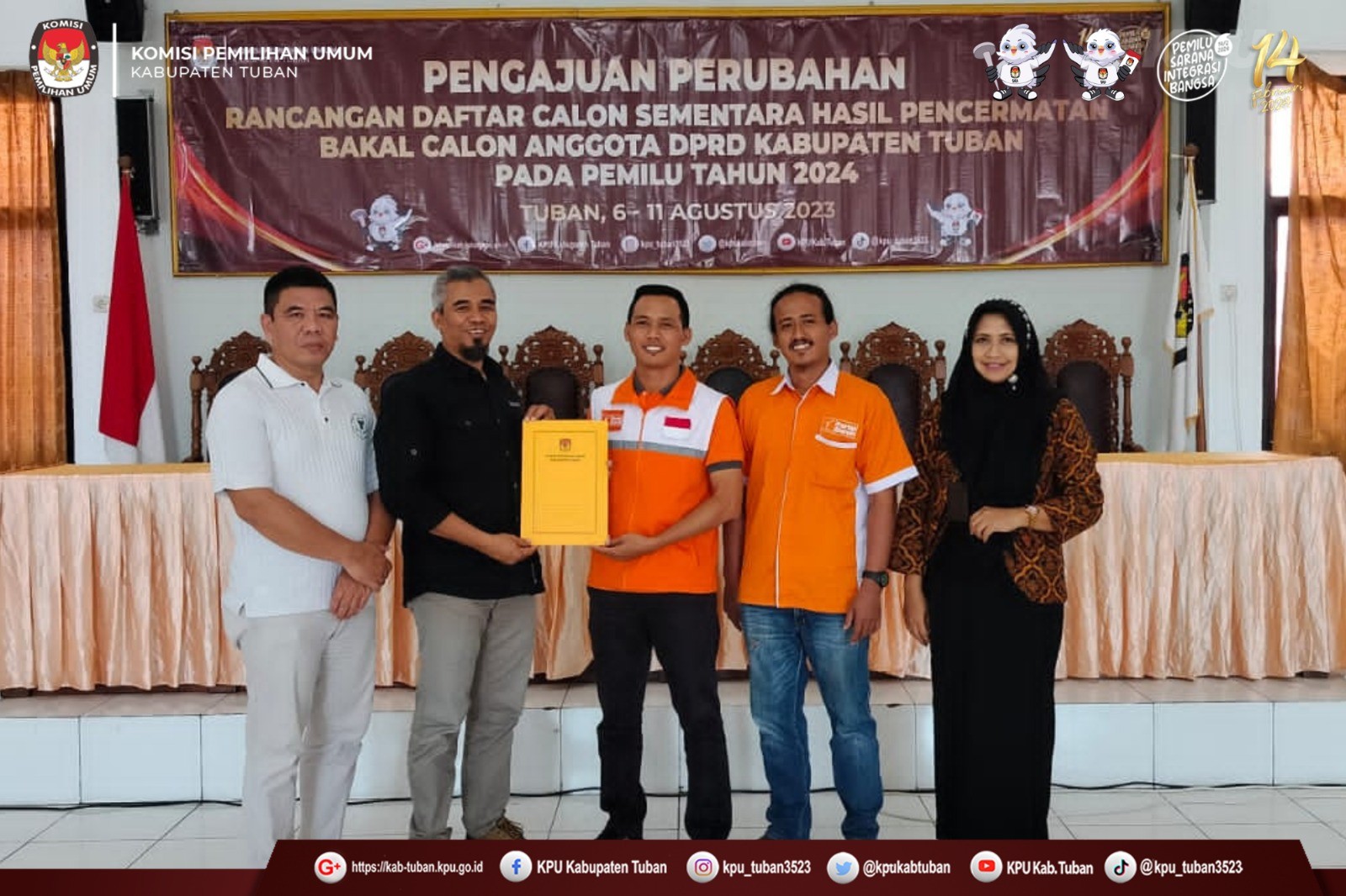 Tuban, kab-tuban.kpu.go.id - Jumat (11/8/2023), KPU Kabupaten Tuban menerima Pengajuan Perubahan Bakal Calon Anggota DPRD Kabupaten Tuban Pemilu Tahun 2024 pada Masa Pencermatan Rancangan Daftar Calon Sementara (DCS) dari Partai Gerakan Indonesia Raya (Partai GERINDRA). (humas)