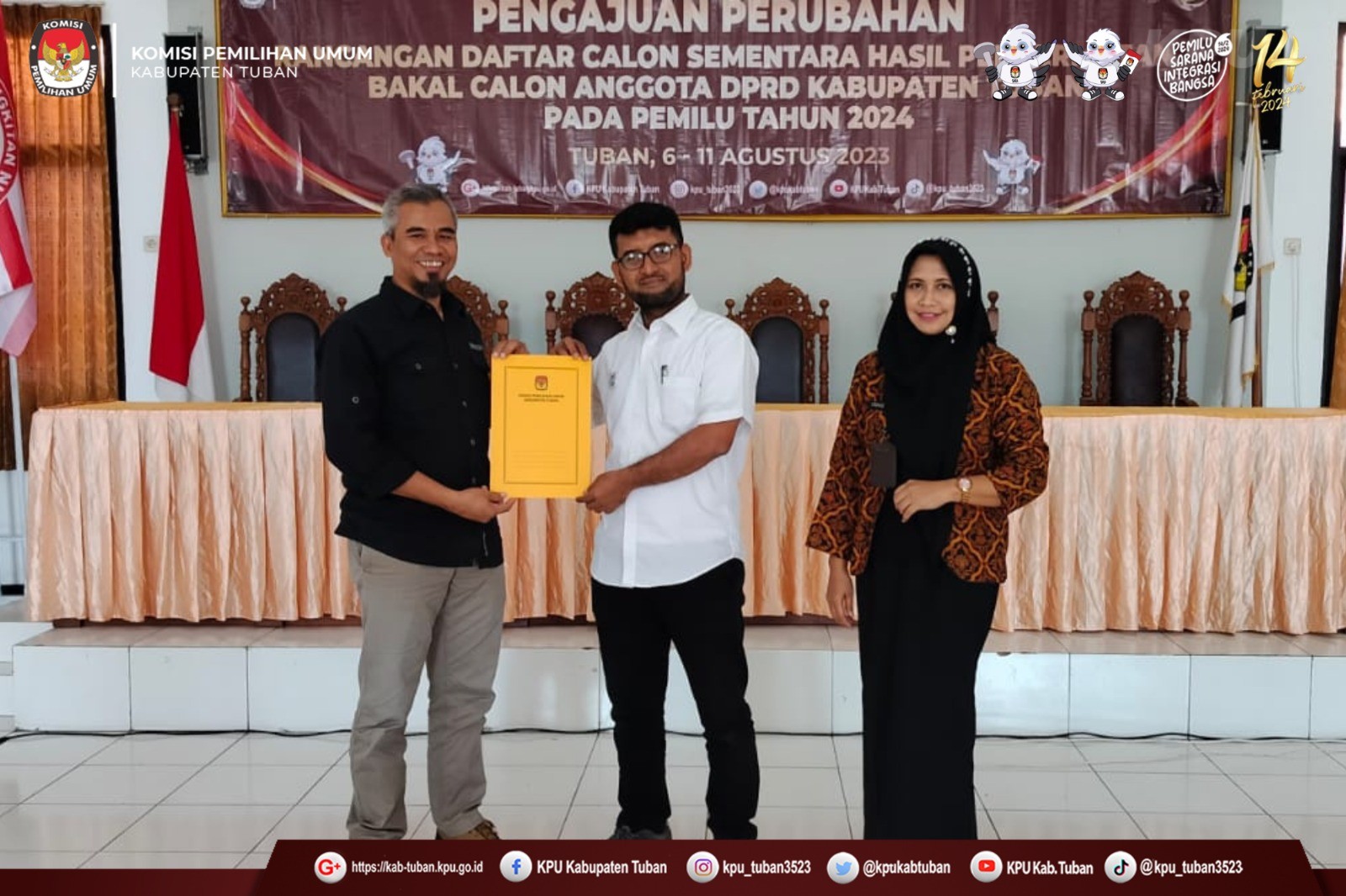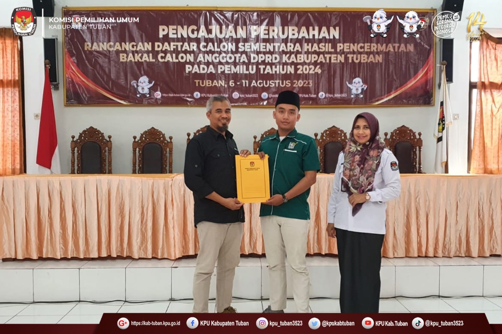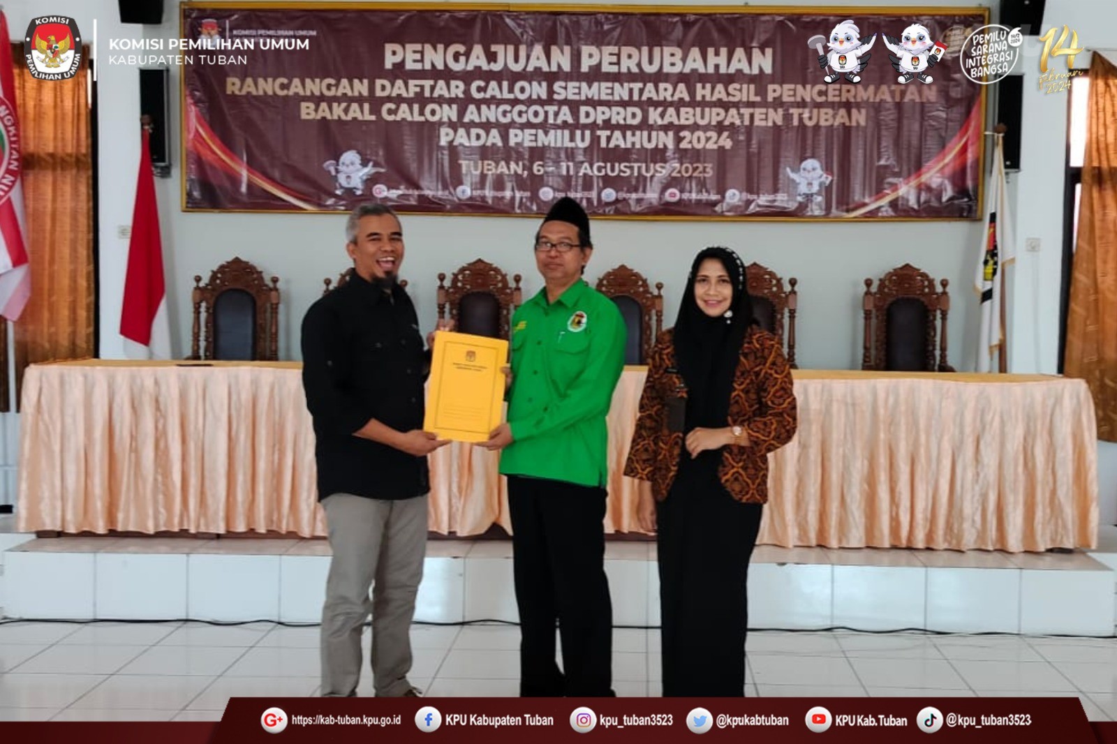 Tuban, kab-tuban.kpu.go.id - Jumat (11/8/2023), KPU Kabupaten Tuban menerima Pengajuan Perubahan Bakal Calon Anggota DPRD Kabupaten Tuban Pemilu Tahun 2024 pada Masa Pencermatan Rancangan Daftar Calon Sementara (DCS) dari Partai Gerakan Indonesia Raya (Partai GERINDRA). (humas)