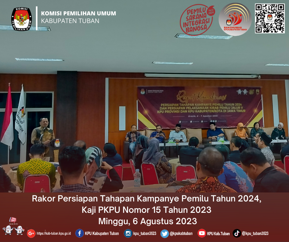 Gresik, kab-tuban.kpu.go.id - Minggu, (6/8/2023) KPU Provinsi Jawa Timur bersama 38 KPU Kabupaten/Kota se-Jawa Timur menggelar Rapat Koordinasi (Rakor) Persiapan Tahapan Kampanye Pemilu Tahun 2024 dan Persiapan Pelaksanaan Kirab Pemilu Jalur V.