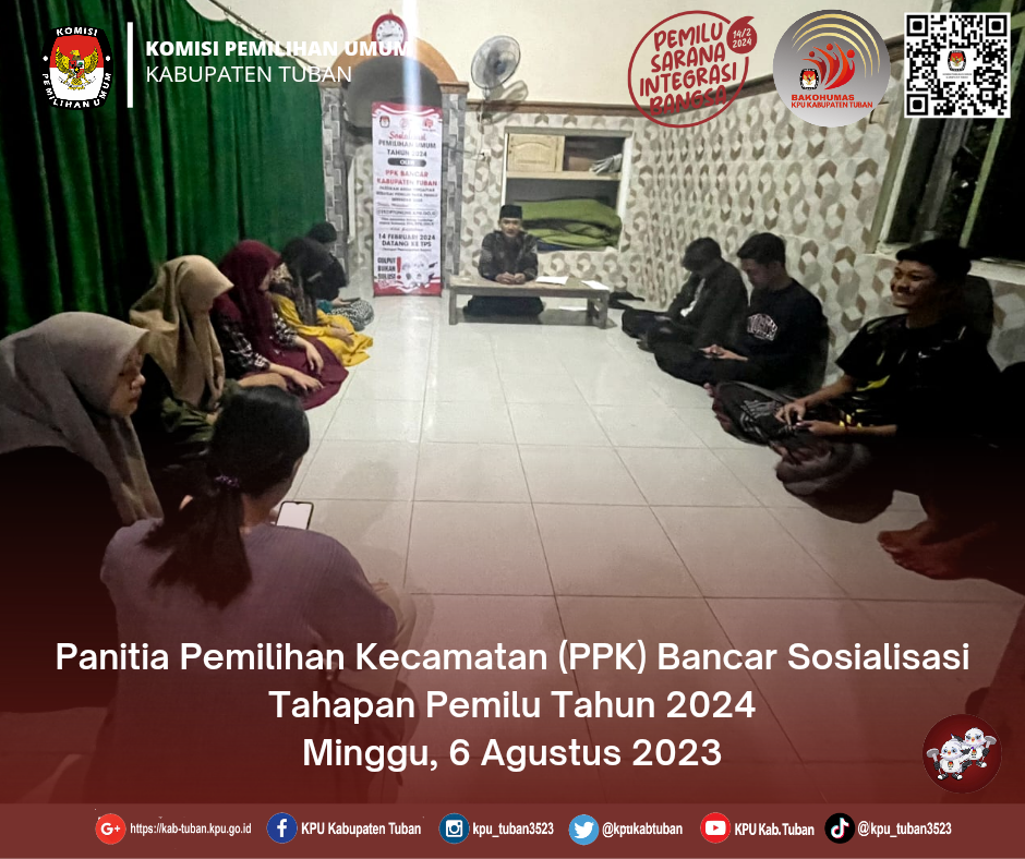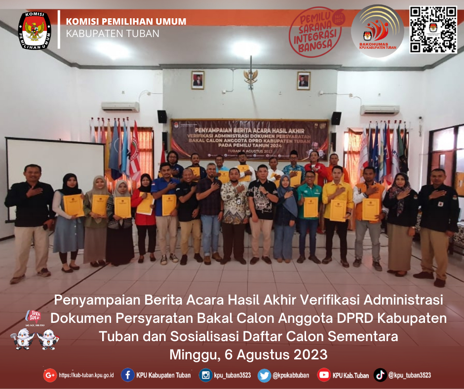 Tuban, kab-tuban.kpu.go.id - Minggu (6/8/2023), KPU Kabupaten Tuban mengundang Pimpinan Partai Politik Peserta Pemilu Tahun 2024 Tingkat Kabupaten Tuban bersama Bawaslu Kabupaten Tuban untuk menghadiri agenda Penyampaian Berita Acara Hasil Akhir Verifikasi Administrasi Dokumen Persyaratan Bakal Calon Anggota DPRD Kabupaten Tuban dan sekaligus Sosialisasi Daftar Calon Sementara (DCS). Acara yang bertempat di Aula Lantai 2 Kantor KPU Kabupaten Tuban, Jalan Pramuka Nomor 3, Sidorejo, Tuban tersebut dibuka oleh Ketua KPU Kabupaten Tuban, Fatkul Iksan. "Sesuai dengan tahapan pencalonan, kita hari ini masuk pada penyampaian Berita Acara. Selanjutnya pencermatan DCS (Daftar Calon Sementara). Sebelum nanti diumumkan di media, silahkan mencermati rancangan DCS. Masih ada kesempatan untuk geser dan ganti calon tapi semua bisa dilakukan atas persetujuan DPP (Dewan Pimpinan Pusat) masing-masing," jelas pria yang biasa disapa Pak Fatkul ini dalam sambutannya. Acara selanjutnya dipandu oleh Divisi Teknis Penyelenggaraan, Nur Hakim yang menjelaskan tahapan pencalonan selanjutnya adalah pencermatan DCS yang dimulai hari ini, tanggal 6 Agustus 2023 hingga tanggal 11 Agustus 2023. Pria kelahiran Lamongan ini juga menjelaskan Verifikasi Administrasi Bakal Calon Pasca Pencermatan DCS, Penyusunan DCS, dan Pengumuman DCS. Acara berikutnya, penyerahan Berita Acara Hasil Akhir Verifikasi Administrasi Dokumen Persyaratan Bakal Calon Anggota DPRD Kabupaten Tuban yang diterima oleh Partai Politik dan Bawaslu Kabupaten Tuban. (humas)