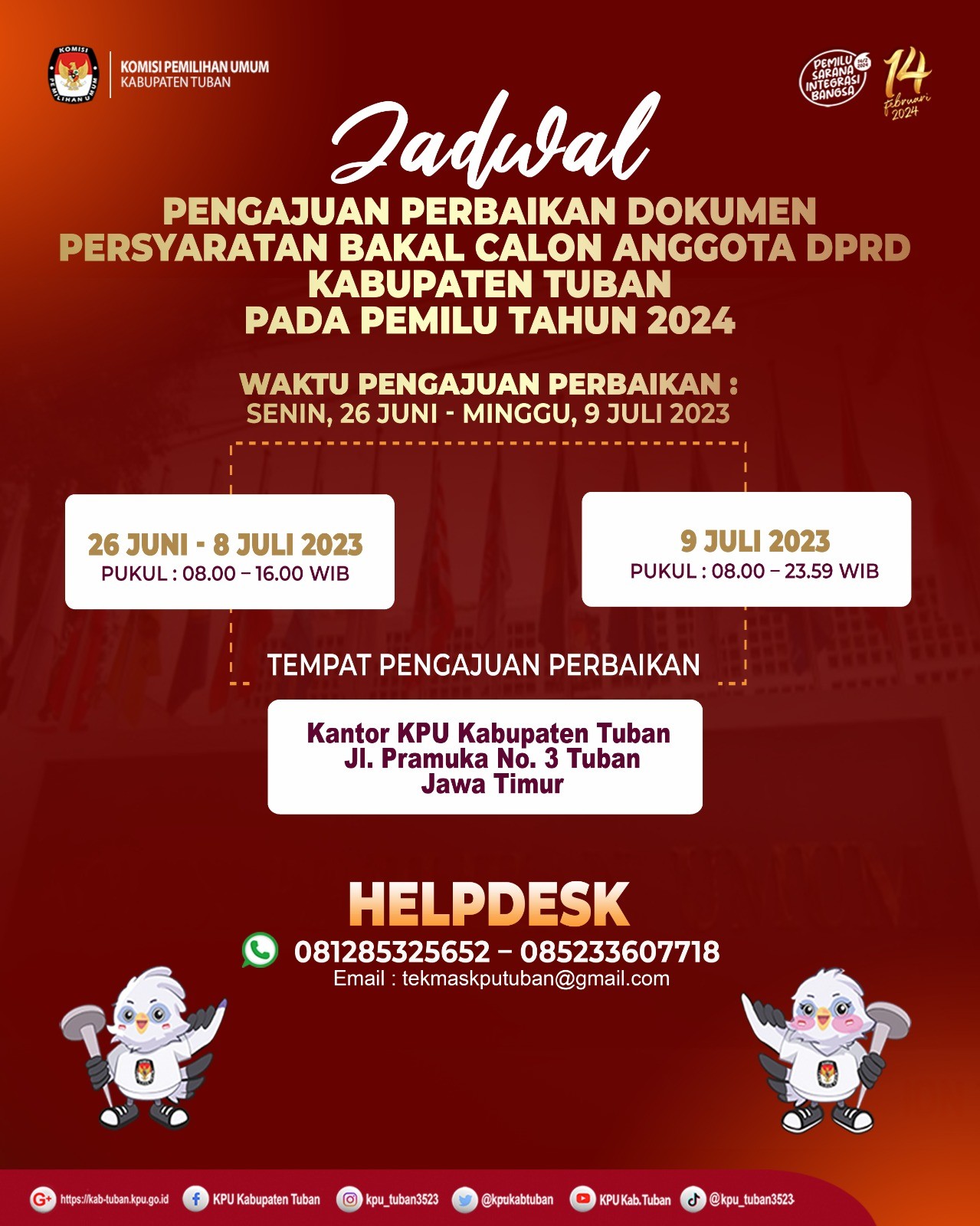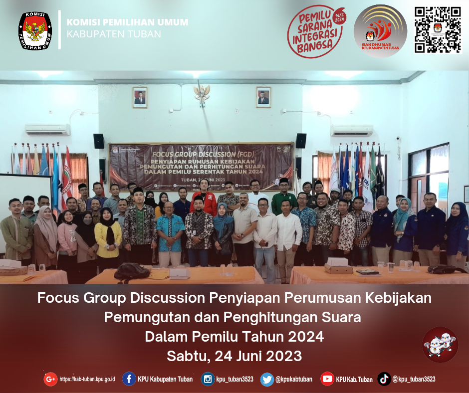 Tuban, kab-tuban.kpu.go.id - Dalam rangka menggali masukan dan menghimpun daftar inventaris masalah terkait pemungutan dan penghitungan suara pada Pemilu, KPU Kabupaten Tuban menggelar Focus Group Discussion (FGD) Penyiapan Perumusan Kebijakan Pemungutan dan Penghitungan Suara Dalam Pemilu Tahun 2024, Sabtu (24/6/2023). Bertempat di Aula Lantai 2 Kantor KPU Kabupaten Tuban, Jalan Pramuka Nomor 3, Sidorejo, Tuban peserta FGD adalah Partai Politik Peserta Pemilu Tahun 2024, LSM/Pegiat Kepemiluan yang diwakili oleh JPPR (Jaringan Pendidikan Pemilih untuk Rakyat) dan JaDI (Jaringan Demokrasi Indonesia), Bawaslu Kabupaten Tuban, dan Panitia Pemilihan Kecamatan yang membidangi Divisi Teknis Penyelenggaraan se-Kabupaten Tuban. Acara dibuka oleh Ketua KPU Kabupaten Tuban, Fatkul Iksan dan selanjutnya dipandu oleh Divisi Teknis Penyelenggaraan, Nur Hakim. "Kami undang Bapak/Ibu sekalian dalam FGD ini untuk mendapatkan masukan dan daftar inventaris masalah tentang pemungutan dan penghitungan suara agar nantinya bisa dijadikan bahan untuk perumusan kebijakan oleh KPU RI," jelas pria yang biasa disapa Pak Hakim. Acara kemudian dilanjutkan dengan diskusi dan penyampaian masukan serta rekomendasi dari peserta yang hadir secara estafet. (humas)