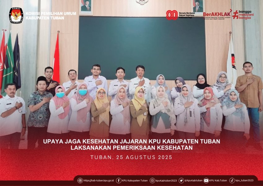 Tuban, kab-tuban.kpu.go.ig - Senin pagi (25/8/2025), Tim Kesehatan dari Puskesmas Tuban lakukan pemeriksaan kesehatan kepada jajaran KPU Kabupaten Tuban mulai dari Ketua dan Anggota KPU Kabupaten Tuban, Sekretaris, Kepala Subbagian, dan seluruh staf termasuk Jagat Saksana.