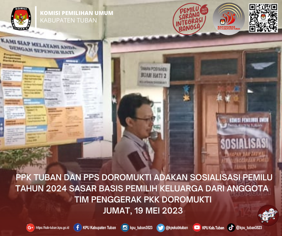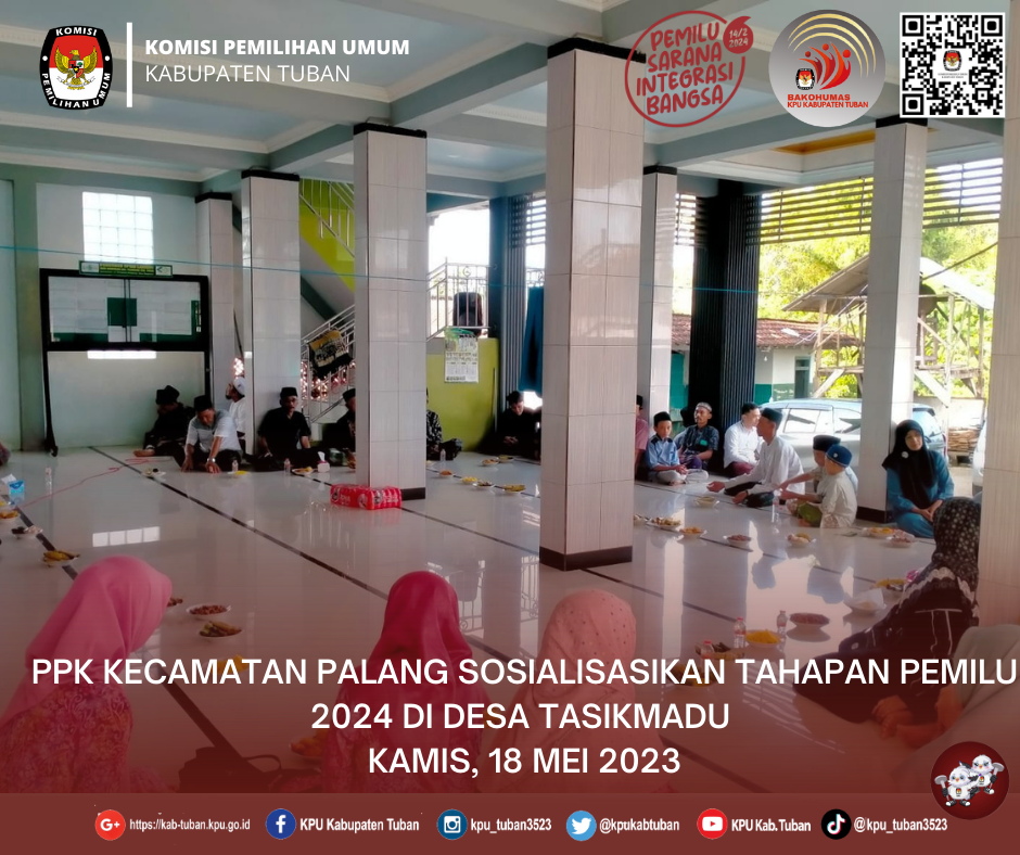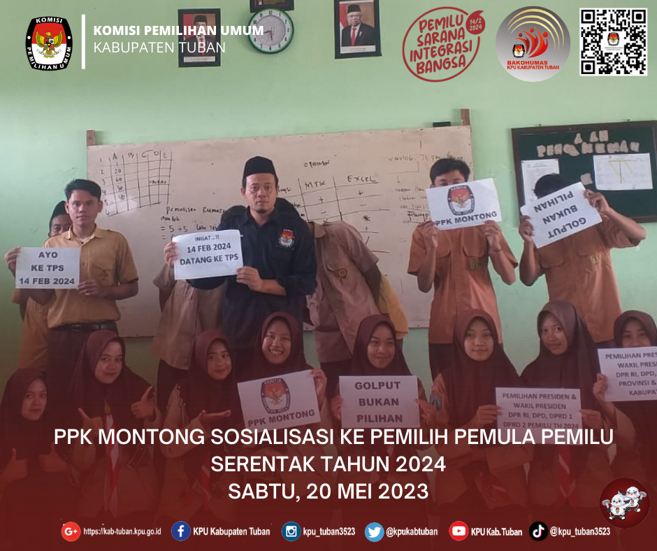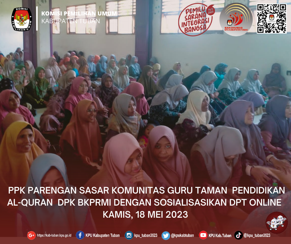 Tuban, kab-tuban.kpu.go.id - Bertempat di SMK Miftahul Hikmah Desa Sukorejo Kecamatan Parengan, pada pukul 10.00 WIB, Kamis (18/05/2023), PPK Parengan melaksanakan Sosialisasi terkait DPT Online untuk Pemilu 2024. Sosialisasi yang sekaligus dikemas dalam kegiatan halal bihalal ini dihadiri oleh 384 Guru Taman Pendidikan Al-Quran Dewan Pengurus Kecamatan Badan Komunikasi Pemuda Remaja Masjid Indonesia (DPK BKPRMI). PPK Parengan hadir dalam sosialisasi diwakili oleh Liswanto selaku Ketua PPK Parengan, Edi Cahyono selaku Divisi Perencanaan, Data dan Informasi, Shofa Arif Arofana selaku Divisi Sosdiklih, Parmas dan SDM serta Rike Widyasari selaku Tenaga Pendukung. Dalam kesempatan ini, Liswanto menghimbau untuk melakukan pengecekan DPT Online. “Untuk memeriksa apakah kita sudah terdaftar sebagai Pemilih di Pemilu 2024, saya meminta kepada saudara untuk mengecek status tersebut secara teknis melalui situs cekdptonline.kpu.go.id. Jika anda belum terdaftar sebagai Pemilih, dimohon untuk segera menghubungi PPK atau PPS terkait,” tegasnya. Selain itu, Liswanto juga menyampaikan bahwasanya Pemilu akan diselenggarakan pada 14 Februari 2024. Partisipasi masyarakat sangat diperlukan untuk keberlangsungan dan kesuksesan pemilu dengan tidak golput dan datang ke TPS. (rw/humas)
