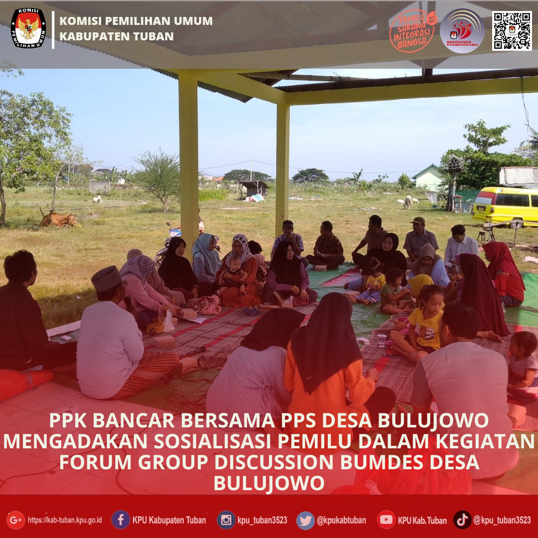 Tuban, kab-tuban.kpu.go.id - Rabu (17/05/2023), perwakilan dari Anggota Panitia Pemilihan Kecamatan (PPK) Bancar melaksanakan Sosialisasi Tahapan Pemilu 2024 , sosialisasi tersebut dihadiri oleh 30 orang yang meliputi jajaran perangkat desa dan anggota BUMDES. Sosialisasi tersebut dilakukan di pasar baru desa Bulujowo kecamatan bancar. Anggota panitia pemungutan suara (PPS) Desa Bulujowo serta perwakilan PPK bancar yang membidangi Divisi Sosdiklih, Parmas, dan SDM ikut berpartisipasi dalam sosialisasi tersebut. ketua PPS menyampaikan keberhasilan pemilu tidak lepas dari pesta demokrasi yang berbasis cerdas dan humanis. Materi disampaikan oleh Eko Hery Priyanto selaku Divisi Sosdiklih, Parmas, dan SDM. Dalam materinya pria yang akrab disapa Mas Eko ini menjelaskan bagaimana peran media sosial yang menghantarkan masyarakat kepada ujaran kebencian maupun berita hoax. Diantaranya dapat dilihat dari berita yang tersebar dalam media sosial yang bersumber dari sumber yang tidak terpercaya, bahkan berita tersebut sering ditemukan di WhatsApp Group. Berita hoax menjadi keresahan masyarakat ditengah riuhnya tahun politik. Masyarakat sedang diuji memilah dan memilih berita mana yang memang dapat dipercaya. Kita semua diajak untuk menjadi pembawa kebenaran dengan memberhentikan penyebarluasan berita hoax, cukup sampai pada diri kita saja. "Pemilu 2024 akan segera tiba. Maka kita juga harus bisa menjadi pemilih yang cerdas dan humanis dengan memilah dan memilih berita yang tersebar dalam media sosial. Dengan semakin dekatnya Pemilu 2024, maka banyak sekali berita / informasi yang tersebar namun belum bisa dipastikan kebenarannya. Sehingga apabila ada berita hoax yang tersebar di media sosial. Jangan sampai kita menyebarkan lagi, cukup berhenti dikita." ujar Eko.(echo/humas)