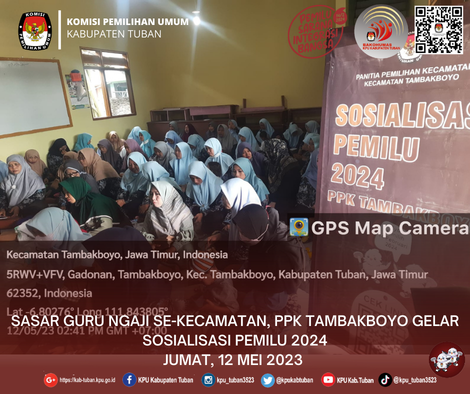 Tuban, kab-tuban.kpu.go.id - Panitia Pemilihan Kecamatan (PPK) Tambakboyo terus melaksanakan sosialisasi kepada masyarakat umum terkait penyelenggaraan Pemilu 2024. Kali ini sasarannya adalah ustaz dan ustazah yang menjadi pimpinan TPQ se-Kecamatan Tambakboyo pada Jumat (12/05/2023).