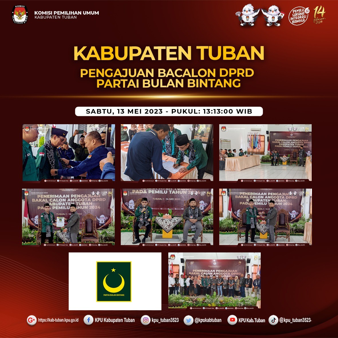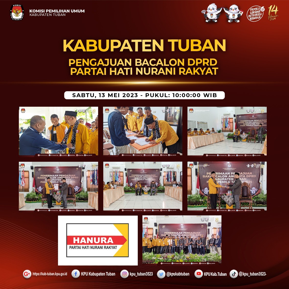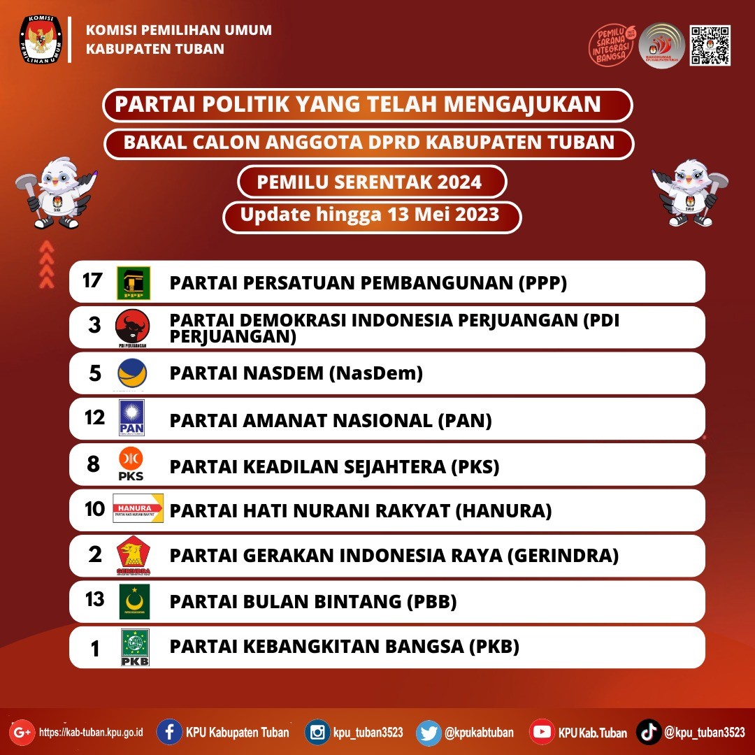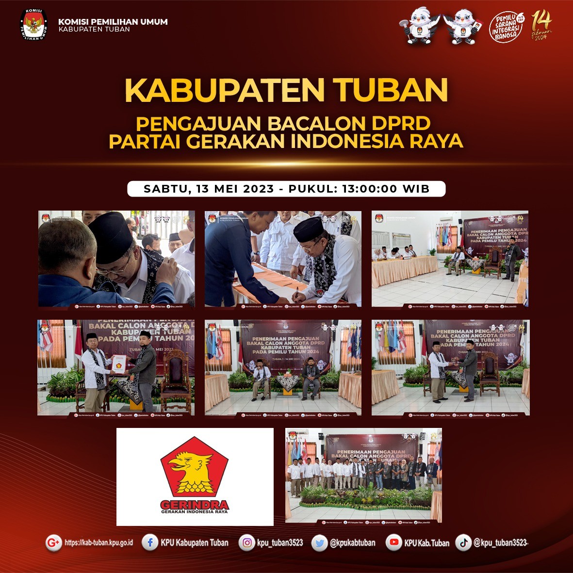 Tuban, kab-tuban.kpu.go.id - Sabtu (13/05/2023), Partai Gerakan Indonesia Raya (Partai GERINDRA) mendatangi Kantor KPU Kabupaten Tuban, Jalan Pramuka Nomor 3, Sidorejo, Tuban untuk Pengajuan Bakal Calon Anggota Dewan Perwakilan Rakyat Daerah (DPRD) Kabupaten Tuban pada Pemilihan Umum Tahun 2024.