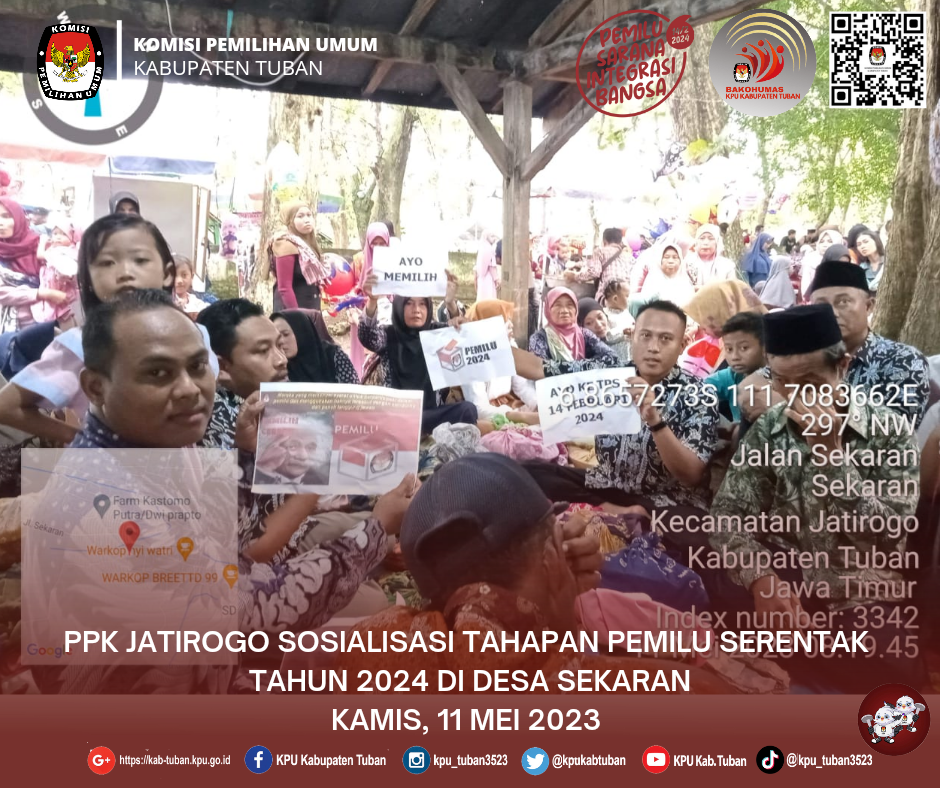 Tuban, kab-tuban.kpu.go.id - Kamis (11/05/2023), perwakilan dari Anggota Panitia Pemilihan Kecamatan (PPK) Jatirogo melaksanakan Sosialisasi Tahapan Pemilu 2024 ke masyarakat Desa Sekaran Kecamatan Jatirogo dengan jumlah peserta sekitar 200 orang.