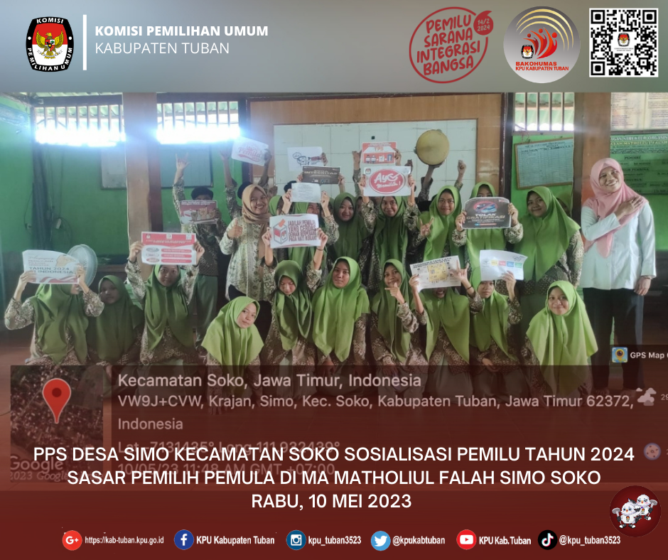 Tuban, kab-tuban.kpu.go.id - Rabu (10/05/2023), Panitia Pemungutan Suara (PPS) Simo Kecamatan Soko gelar Sosialiasi Pemilu Tahun 2024 di Aula MA Matholiul Falah Desa Simo Kecamatan Soko dengan menyasar Pemilih Pemula. Ketua PPS Simo, Roudhotun Nikmah berharap nantinya kegiatan ini bisa memberikan pengetahuan tentang informasi kepemiluan yang akan dilaksanakan di tahun 2024. Dalam kegiatan ini hadir Kepala Madrasah Makmur Sanawi. "Saya ucapkan terima kasih kepada Jajaran PPK (Panitia Pemilihan Kecamatan) Soko dan PPS Simo yang sudah hadir memberikan informasi terkait kepemiluan, saya berharap kegiatan seperti ini dilakukan secara berkelanjutan dan berdampak positif terhadap anak didik,“ ujar Makmur pada saat memberikan sambutan. Kegiatan ini merupakan rangkaian dari program PPS Desa Simo dan PPK Soko yang membidangi Dvisi Sosdiklikh, Parmas, SDM, Z. Arifin. Di kesempatan lain, pria yang biasa disapa Pak Arifin menyampaikan bahwa kegiatan ini akan dilakukan secara terus menerus sesuai dengan tahapan yang berjalan dan akan lebih ditingkatkan utamanya sosialisasi terhadap Pemilih Pemula yg minim akan pengetahuan kepemiluan. "Setiap desa kami target minimal 1 kali sosialisasi dalam satu bulan. Dengan sosialisasi yang berkalanjutan ini, kami berharap pemilih pemula nanti bisa menjadi menjadi pemilih yang cerdas dalam menggunakan hak pilihnya," pungkasnya. (za/humas)