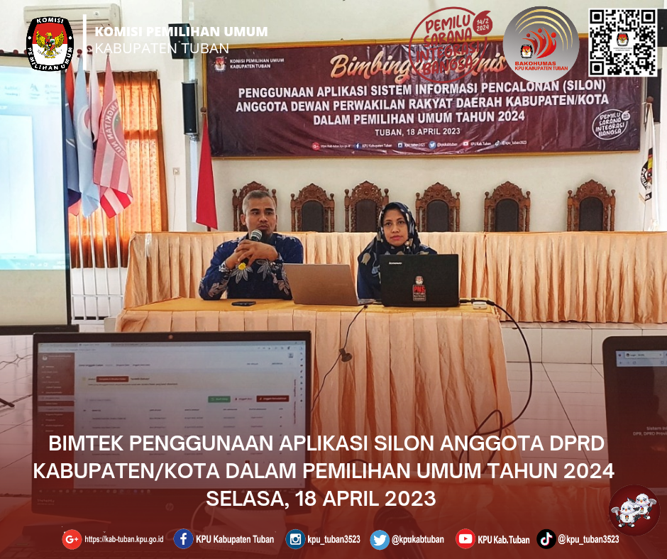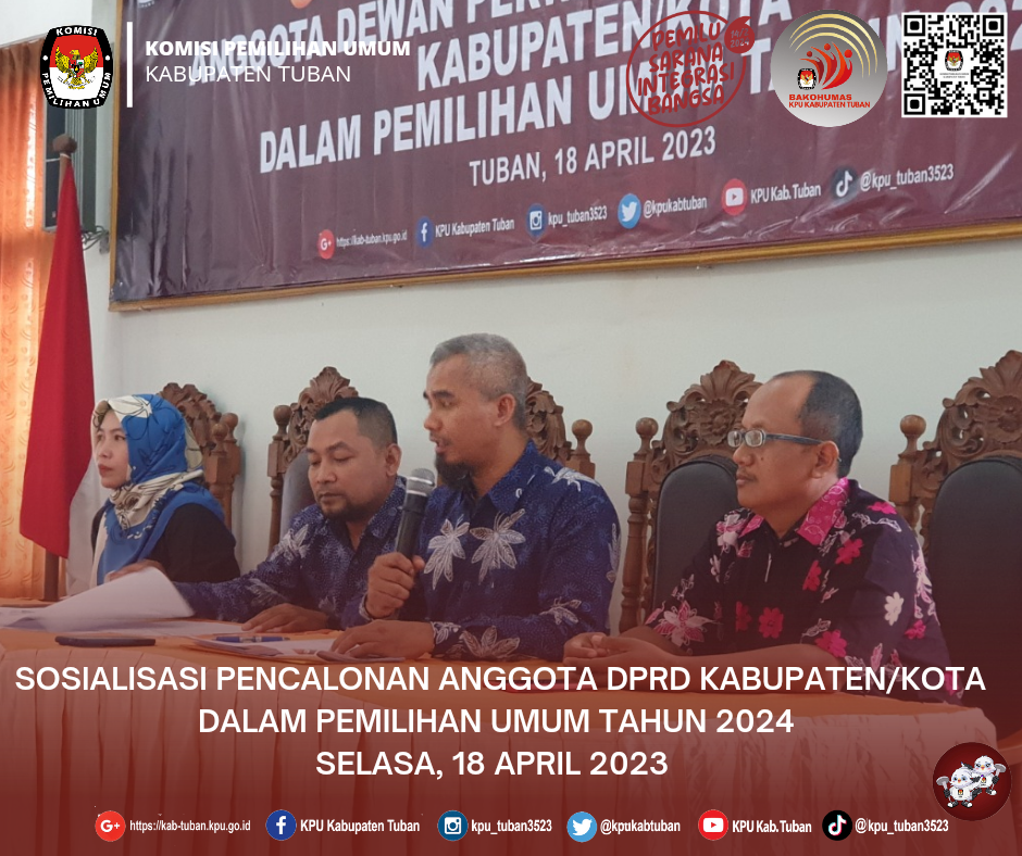 Tuban, kab-tuban.kpu.go.id - Selasa (18/04/2023), KPU Kabupaten Tuban laksanakan Sosialisasi Pencalonan Anggota Dewan Perwakilan Rakyat Daerah (DPRD) Kabupaten/Kota Dalam Pemilihan Umum Tahun 2024.