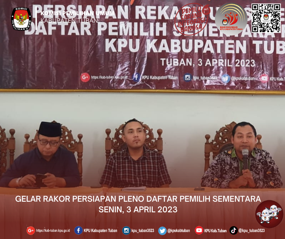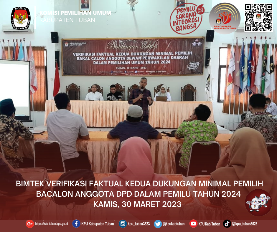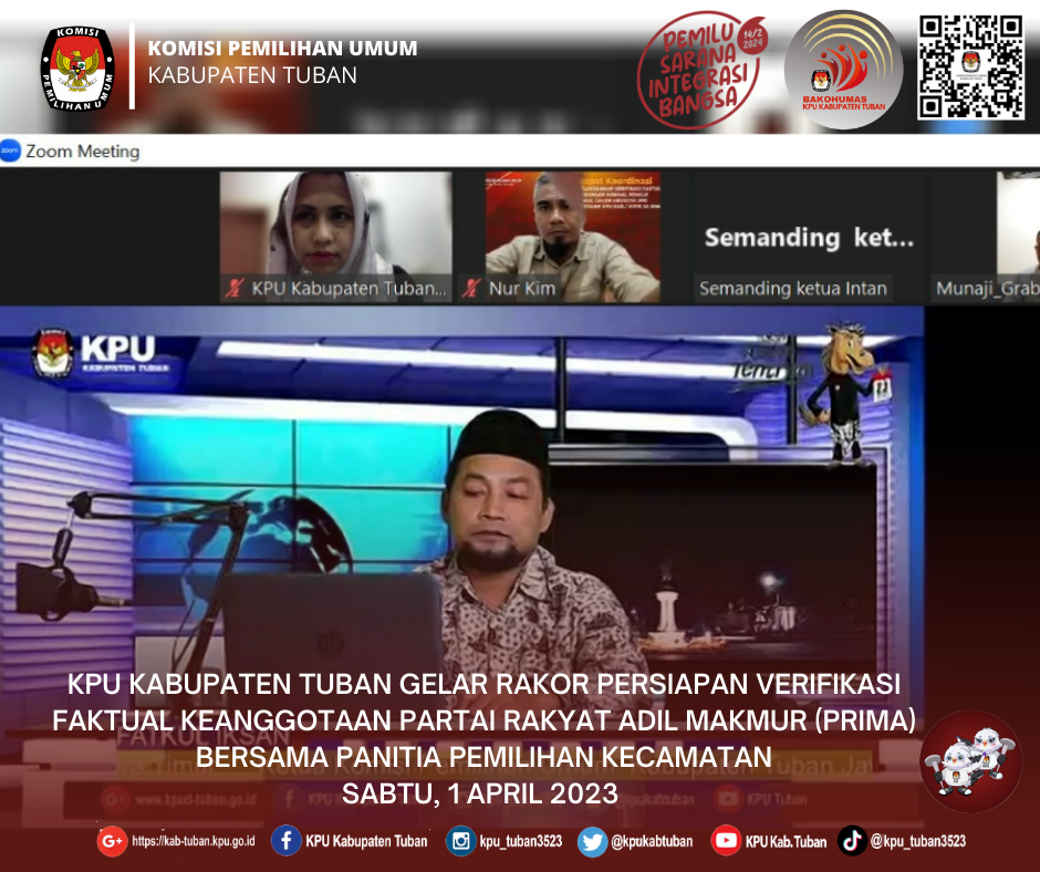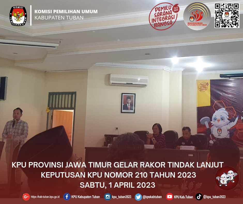 Sidoarjo, kab-tuban.kpu.go.id - Sabtu pagi (01/04/2023), 38 KPU Kabupaten/Kota se-Jawa Timur menghadiri Rapat Koordinasi Tindak Lanjut Keputusan KPU Nomor 210 Tahun 2023 di Kantor KPU Kabupaten Sidoarjo, Jalan Raya Cemeng Kalang Nomor 1, Ngemplak, Sidoarjo. Hadiri perwakilan dari KPU Kabupaten Tuban, Fatkul Iksan, Divisi Teknis Penyelenggaraan, Nur Hakim, dan Kasubbag Teknis Penyelenggaraan Pemilu, Partisipasi, dan Hubungan Masyarakat, Endang Sri Arti Rahayu. Rakor pada kesempatan kali ini diselenggarakan untuk menindaklanjuti Keputusan KPU Nomor 210 Tahun 2023 tentang Tahapan, Program, dan Jadwal Penyampaian Dokumen Persyaratan Perbaikan, Verifikasi, dan Penetapan Partai Politik Peserta Pemilihan Umum Anggota DPR dan DPRD Tahun 2024 Sebagai Tindak Lanjut Putusan Bawaslu RI Terhadap Partai Rakyat Adil Makmur (PRIMA). Acara dibuka oleh Ketua KPU Provinsi Jawa Timur, Choirul Anam. Yang kemudian dilanjutkan dengan pengarahan dari Divisi Teknis Penyelenggaraan, Insan Qoriawan. "Berdasarkan Surat Keputusan 210 Tahun 2023 KPU akan melaksanakan verfak (verifikasi faktual) kepengurusan dan keanggotaan Partai Rakyat Adil Makmur oleh KPU Kabupaten/Kota dimulai hari ini Sabtu, 1 April sampai dengan Selasa, 4 April 2023," jelas Insan. "Sebelum pelaksanaan verfak kepengurusan dan keanggotaan KPU Kabupaten/Kota berkoordinasi dengan Bawaslu Kabupaten/Kota mengenai rencana, jadwal dan lokasi pelaksanaan verfak di wilayah masing-masing,” jelasnya kembali. (humas)