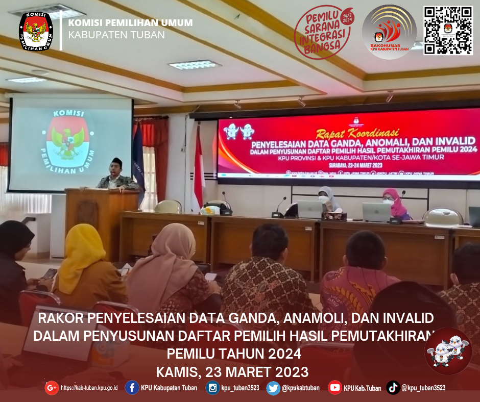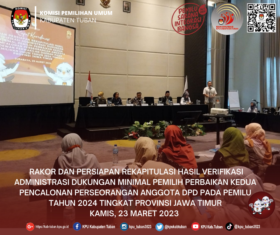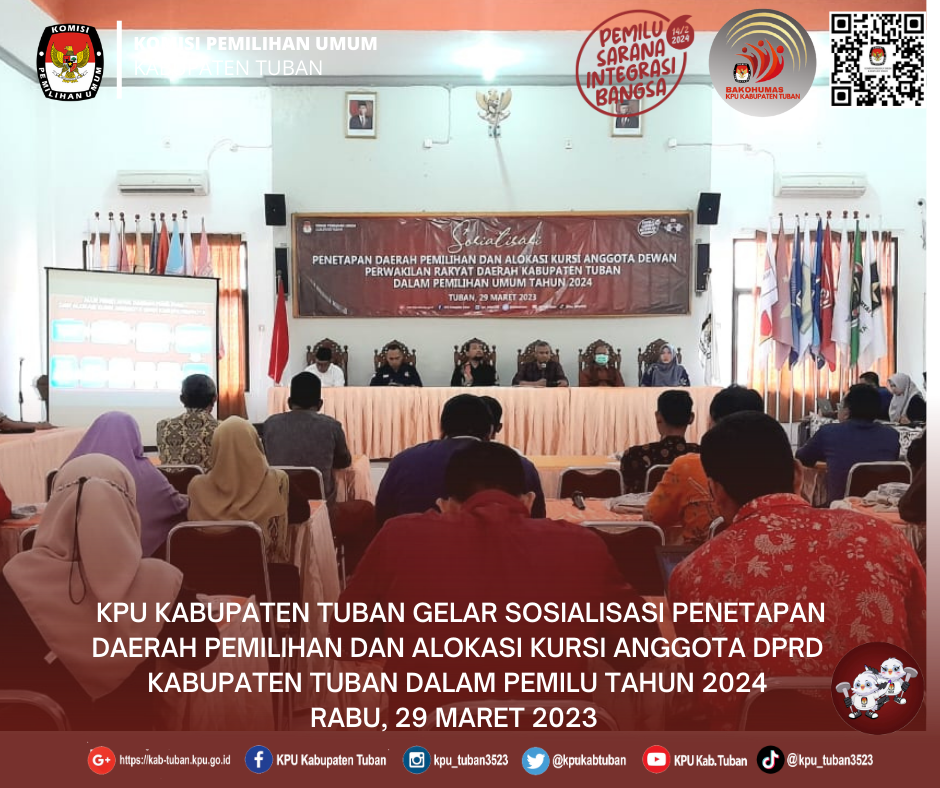 Tuban, kab-tuban.kpu.go.id - Bersama electoral stakekeholder dan instansi terkait di wilayah administratif Kabupaten Tuban, Rabu pagi (29/03/2024) KPU Kabupaten Tuban gelar Sosialisasi Penetapan Daerah Pemilihan (Dapil) dan Alokasi Kursi Anggota Dewan Perwakilan Daerah (DPRD) Kabupaten Tuban Dalam Pemilu Tahun 2024.