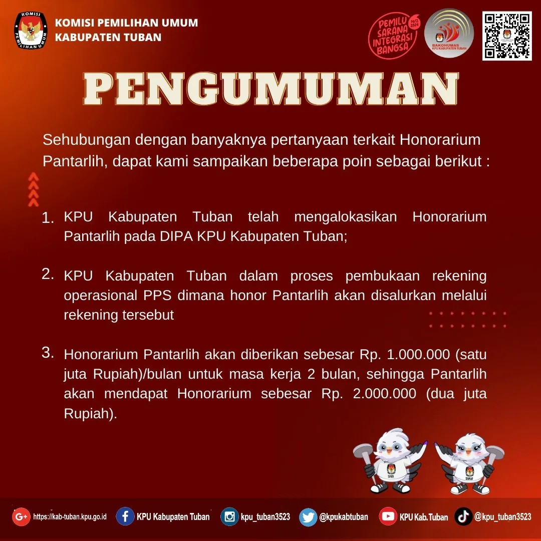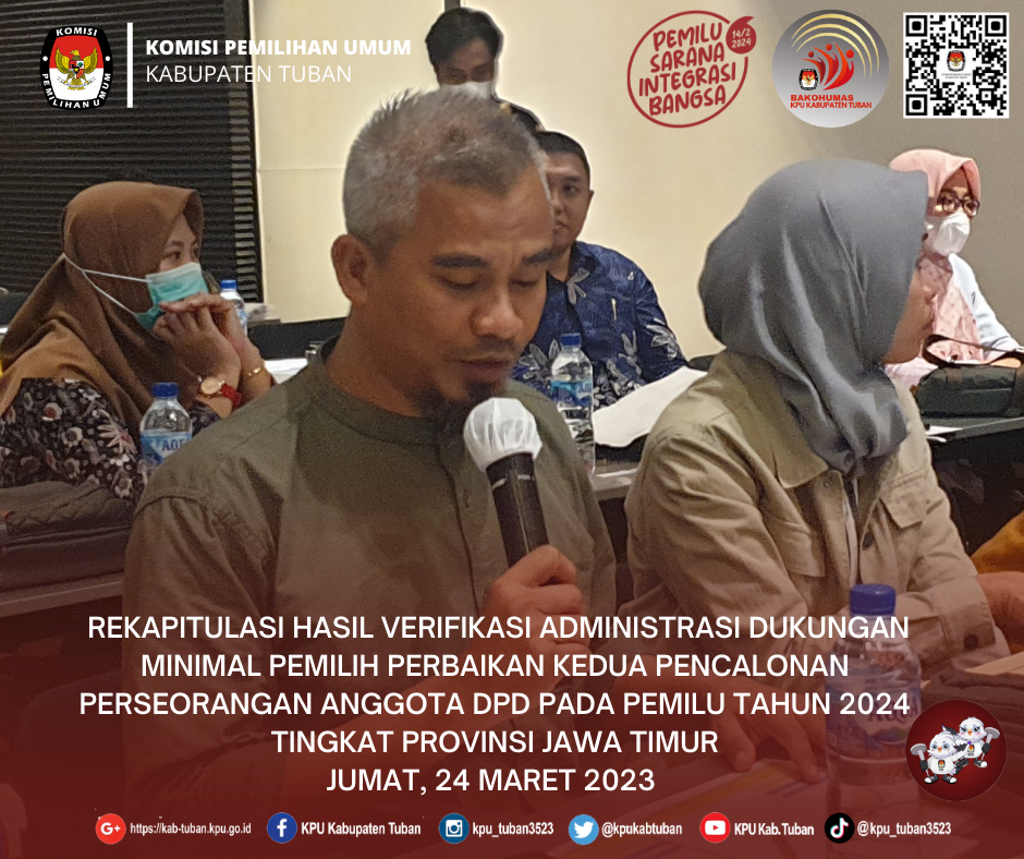 "Dapil dan alokasi kursi Anggota DPRD Kabupaten Tuban untuk Pemilu Tahun 2024 tidak mengalami perubahan. Sama dengan Pemilu 2019 atau dikenal dengan istilah eksisting. Perubahan hanya pada pemilihan diksi yang semula penyebutan Dapil 1, Dapil 2, Dapil 3, Dapil 4, dan Dapil 5 sekarang penyebutannya adalah Tuban 1, Tuban 2, Tuban 3, Tuban 4, dan Tuban 5," jelas pria yang berdomisili di Kecamatan Palang ini. (humas)